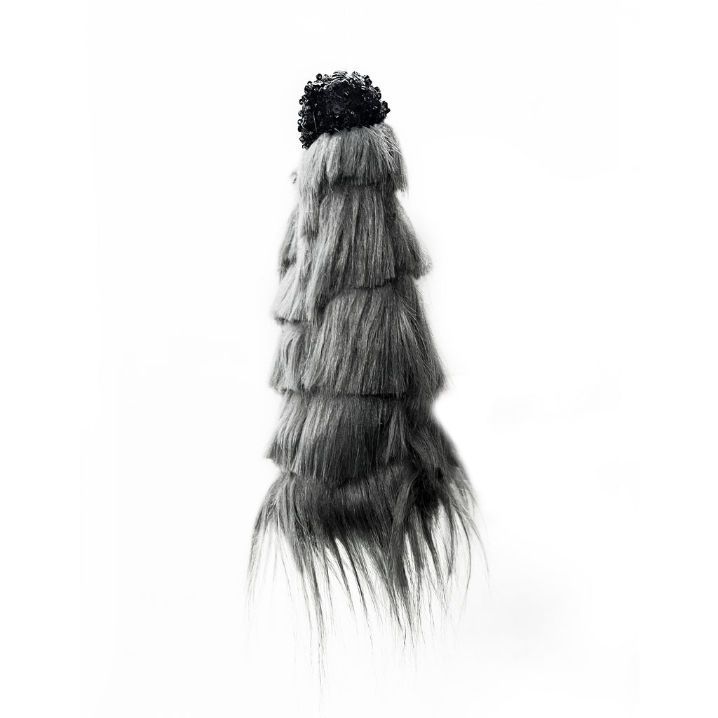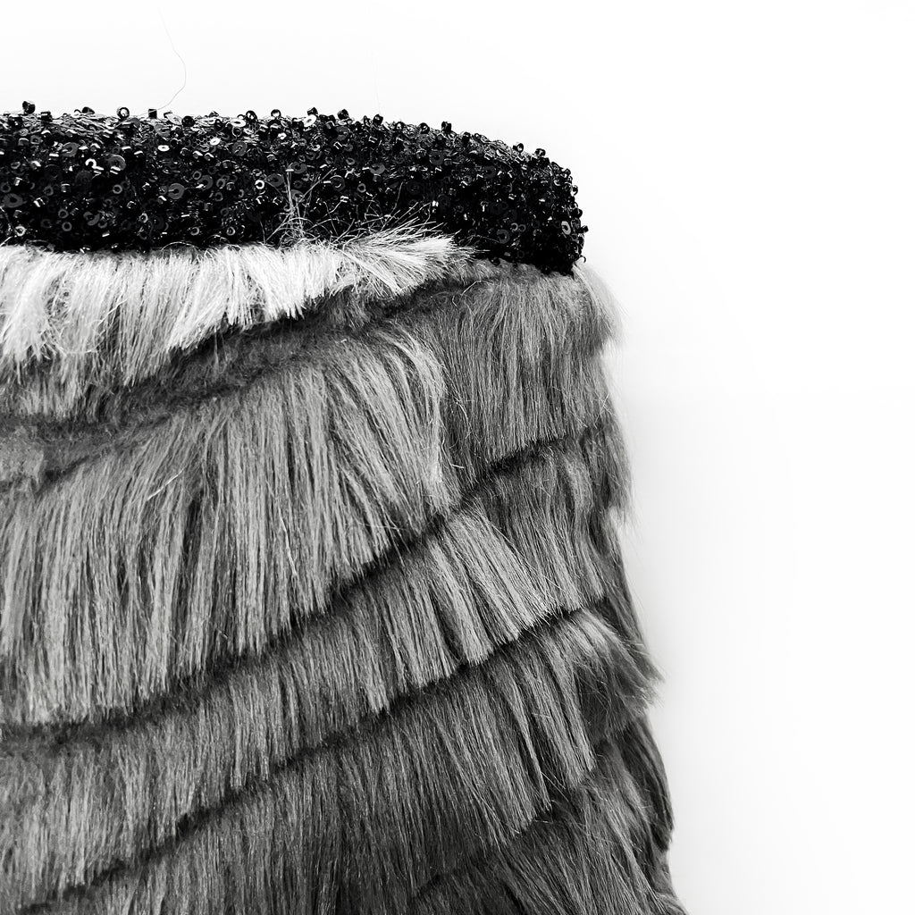 A luxurious fur clutch, adorned with black embroidery, perfect for a chic night out. The fur has been meticulously hand cut making it for a statement making accessory. Its compact design offers just enough space for essentials, while the tactile surface adds a touch of glamour to any outfit.