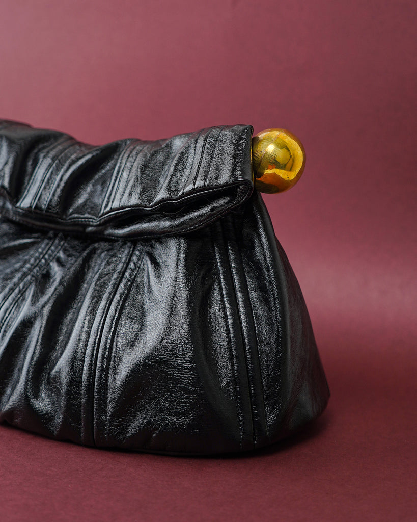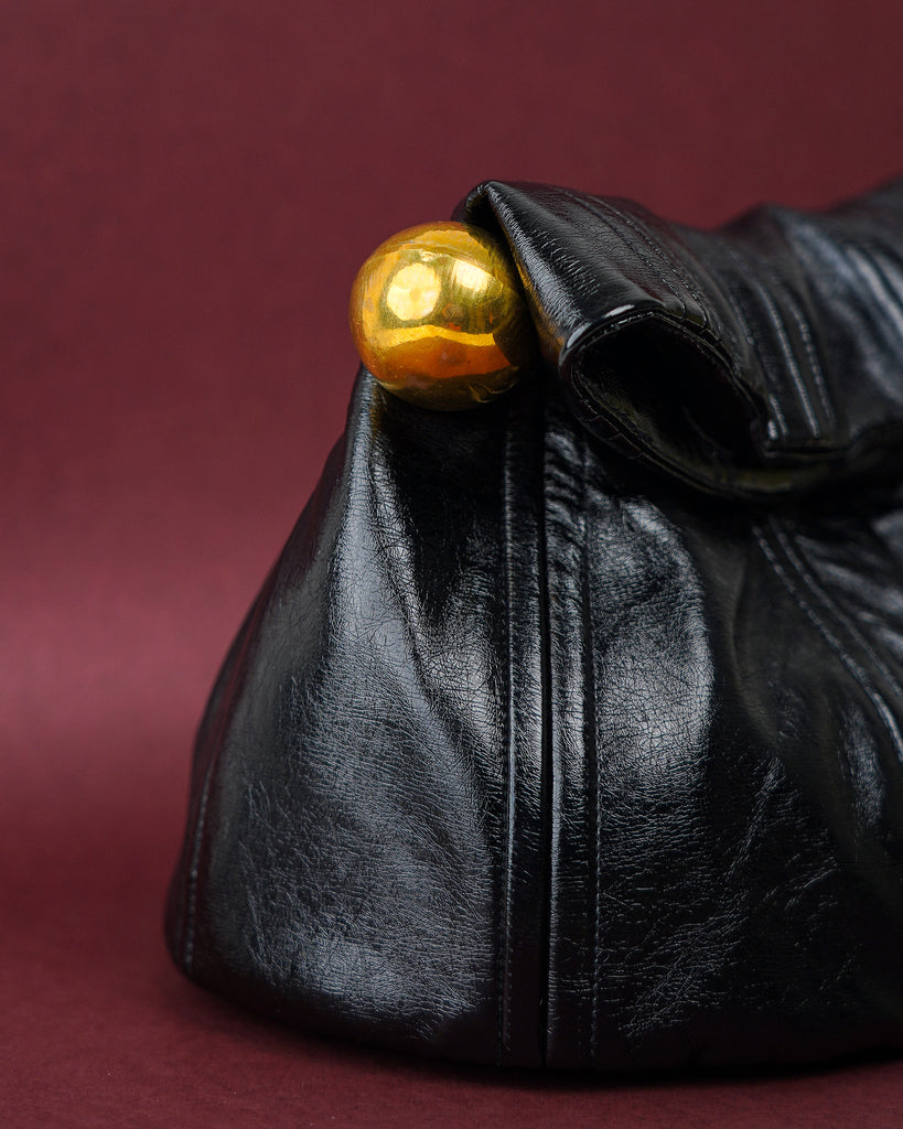 Featuring a black faux crush leather Dome bag with boning for structure and gold balls on the either sides.
