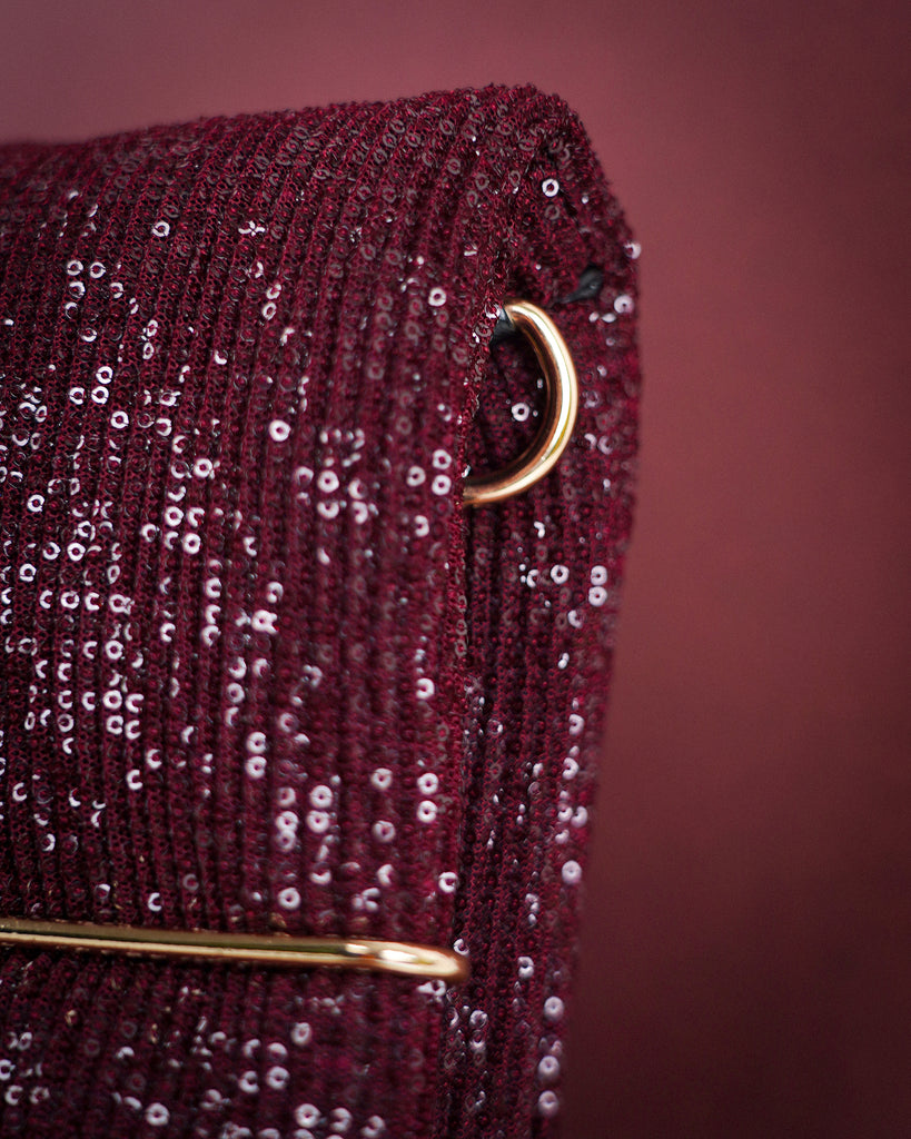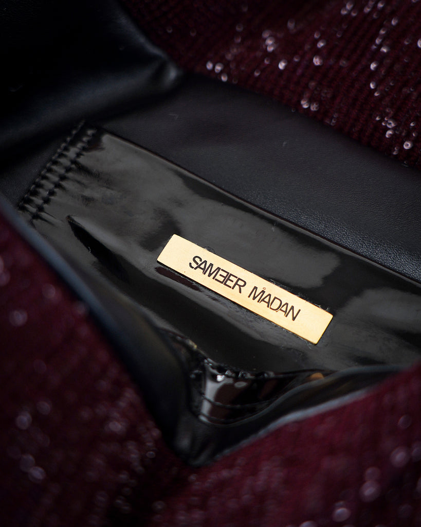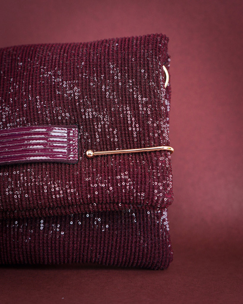 Featuring a Pillow Bag with all over maroon sequin with gold metal clips on the side with Faux patent leather lines hand strap.