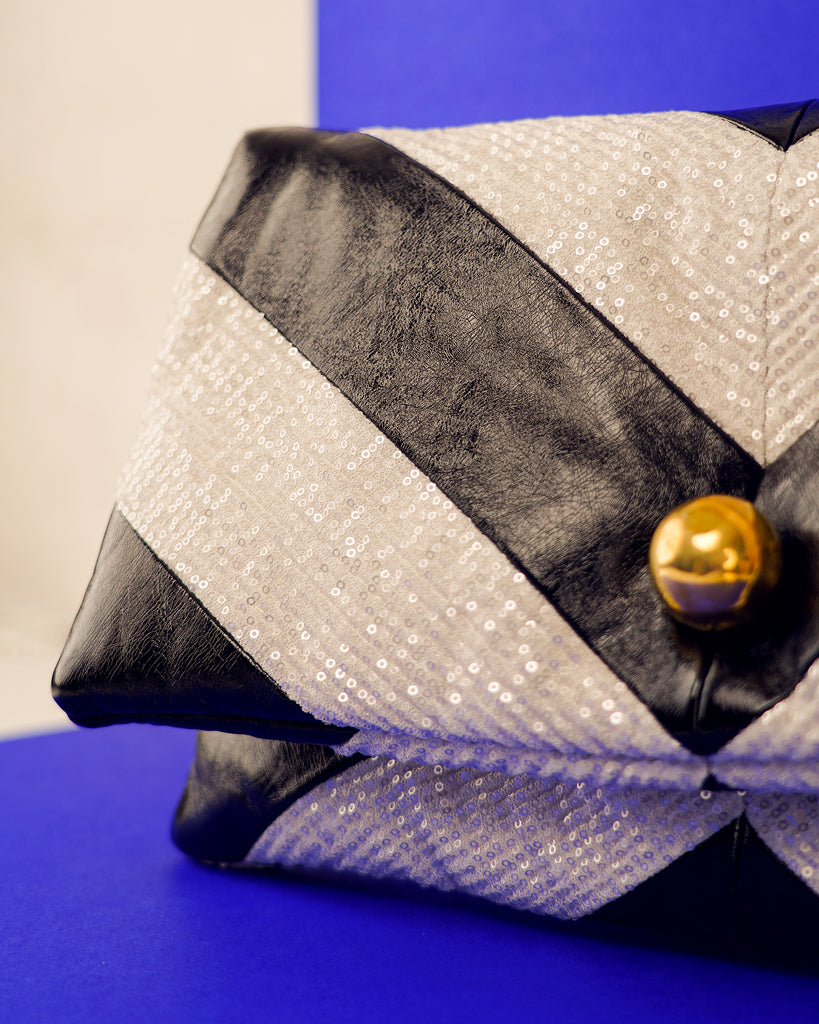 Featuring a Pillow Bag with white sequin and black faux crush leather design and a gold ball with magnetic buttons. A Faux fur black wristlet adds to the look of the bag.