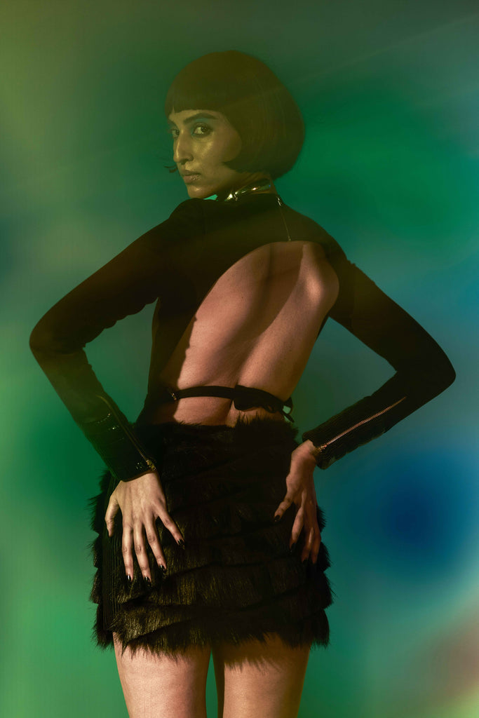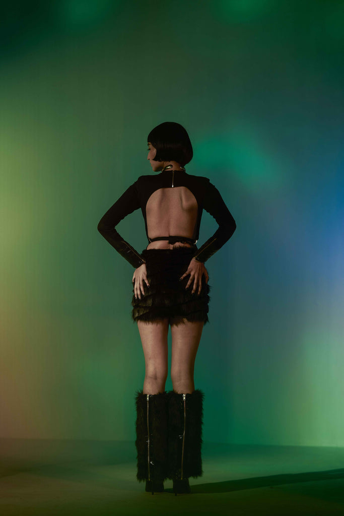 Introducing the effortlessly chic 'Sirena' bodysuit, a stunning piece that marries style with sensual allure. This exquisite design features glossy faux leather quilting on the cuffs of the full sleeves, ascending gracefully to the shoulders. The shoulders are adorned with a sheer stretchable mesh panel, adding a touch of provocative elegance. The back boasts a beautiful deep window cutout with tie-able straps, elegantly secured by two metal trims, creating a captivating focal point. Perfect for a stylish night out, 'Sirena' is the ultimate choice for those seeking a blend of sophistication and allure. Elevate your evening look with this enchanting bodysuit.