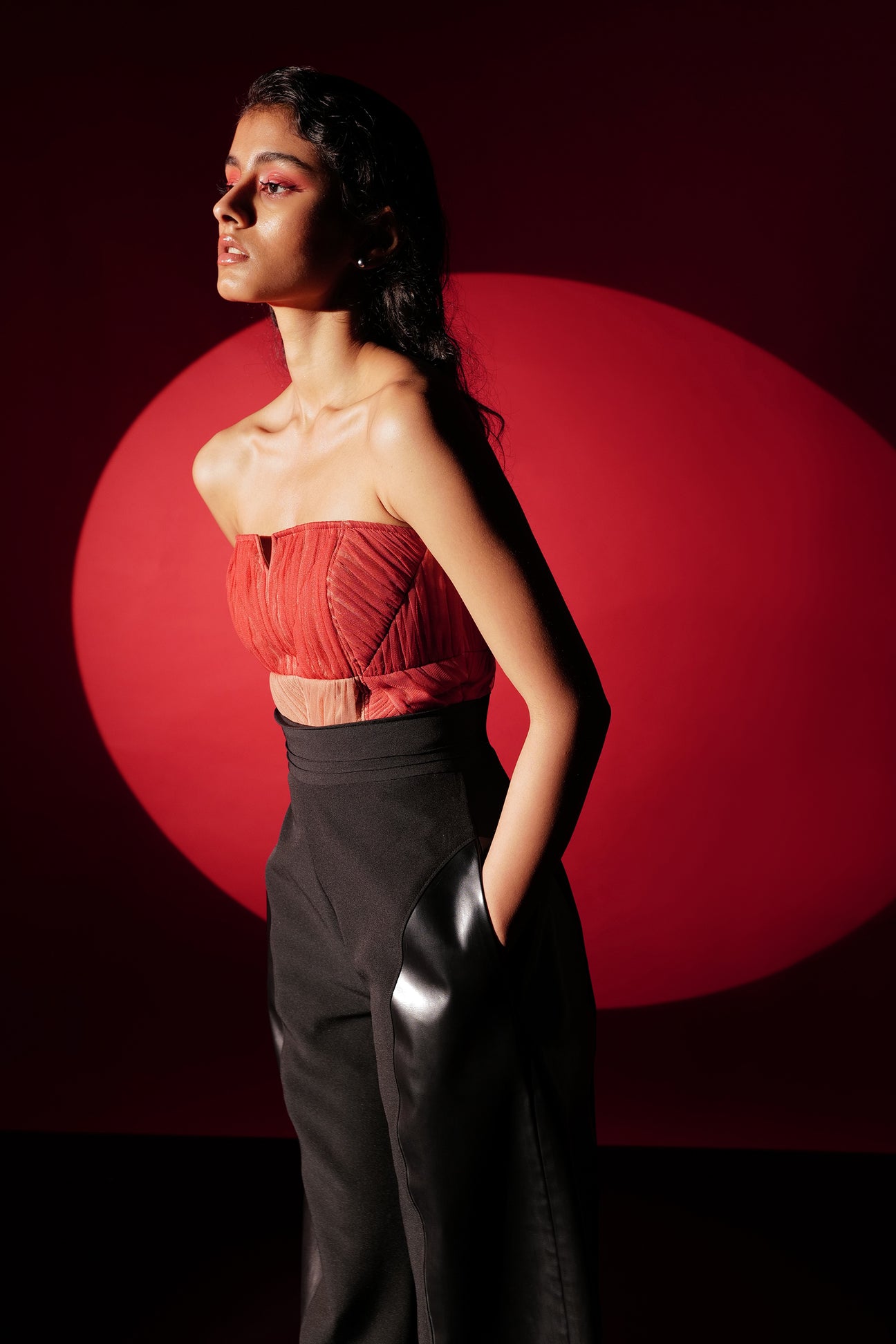 Featuring a Scarlett tube bodysuit with multiple net, hand ruched panels.