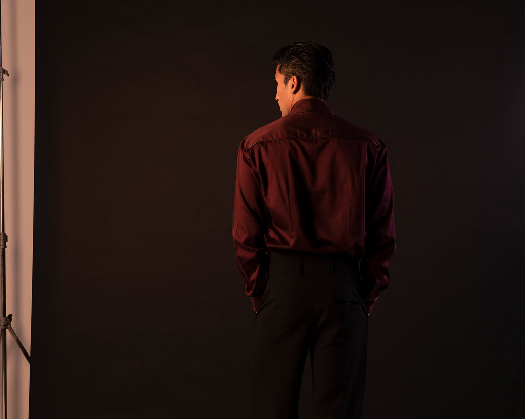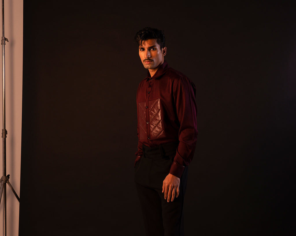 Featuring a maroon cotton shirt with faux crush leather detail in the front.