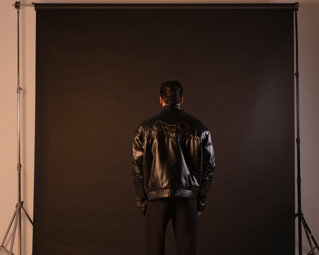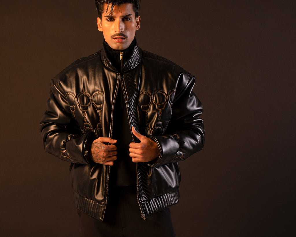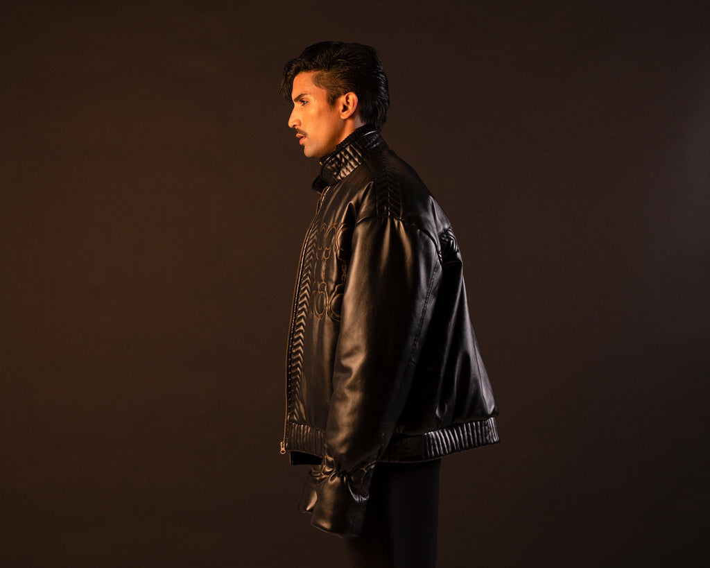Featuring a faux matte leather jacket with embroidery on the jacket and exaggerated sleeves.