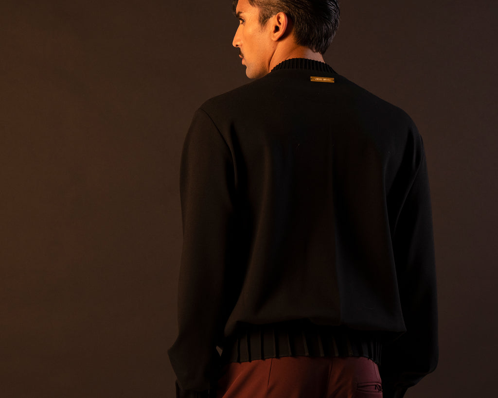 Featuring a black banana crepe sweatshirt with gold loops on the front and pin tucks on the neckline , cuff and waistband.
