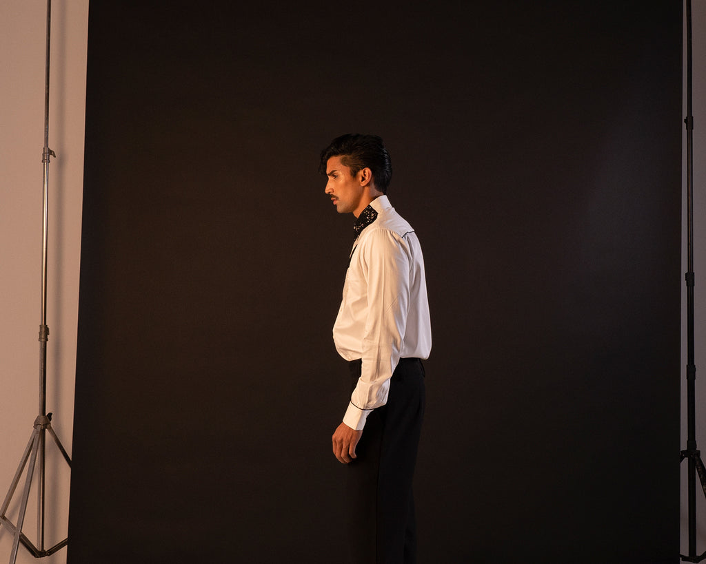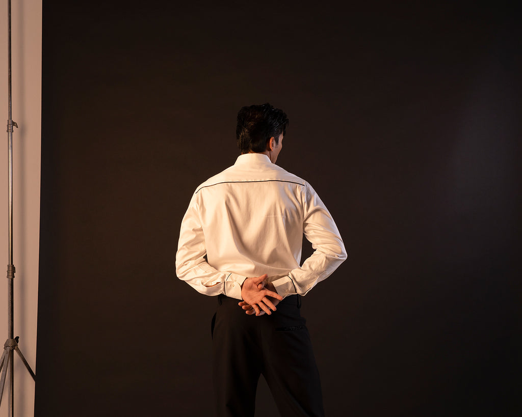 Featuring a white cotton shirt with sequin on the collar and the front body to elevate the look.