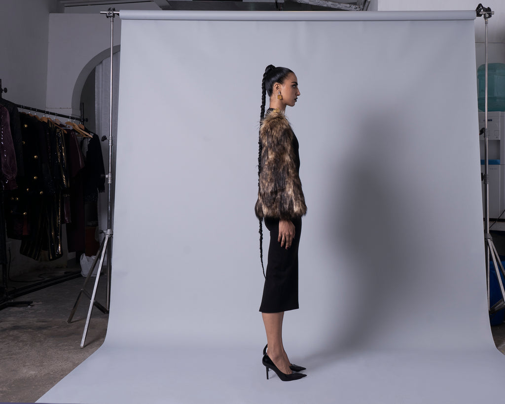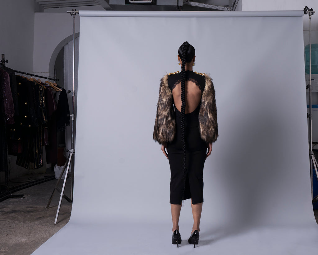 Featuring a classic black bodycon with faux fur sleeves and gold metallic balls adorning the shoulders with a scoop cut-out at the back.