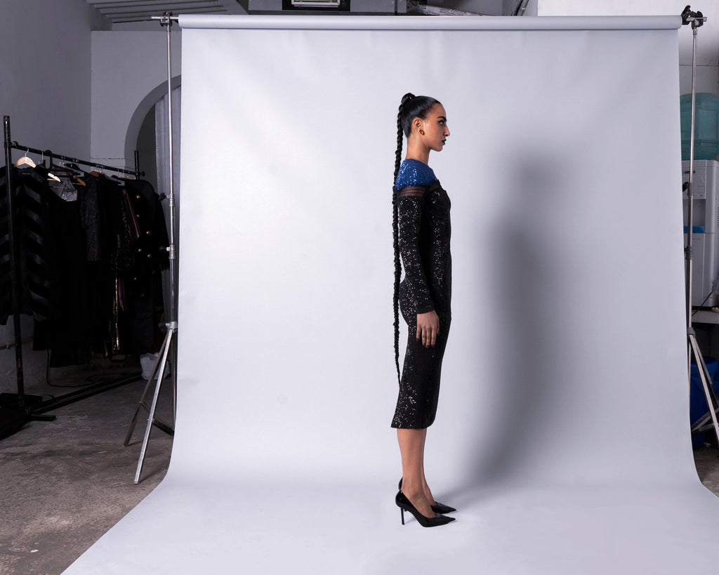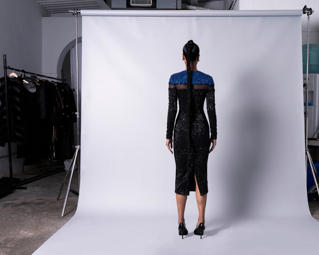 Featuring a color block sequins bodycon with a lace detail on the front yoke of the dress.