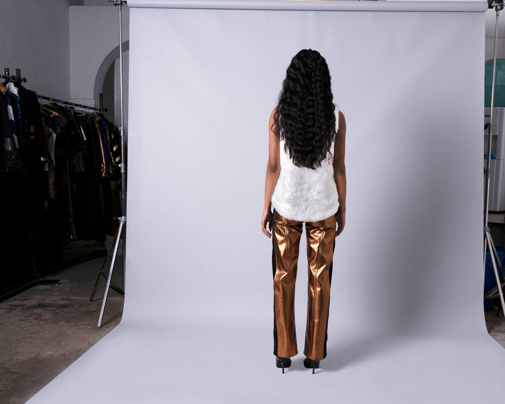 Featuring a faux fur top with plunge neckline and metallic loop details on the side seams and shoulders.