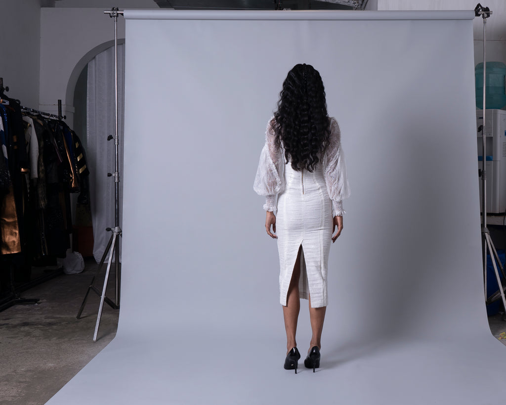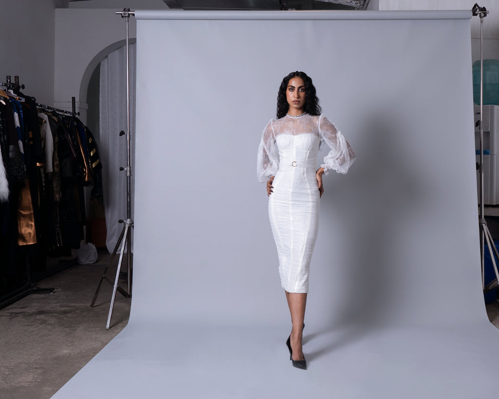 Featuring a bodycon entirely ruched with lace fabric, bishop sleeve with mini ruffle detail and waist cinched and tied up with a loop.