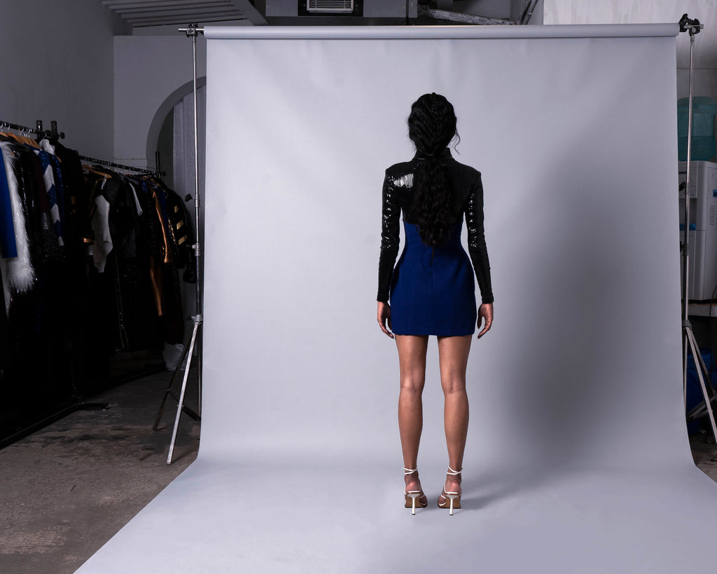 Featuring a colour block mini dome dress, with a felt skirt bottom and a leather line high neck top.
