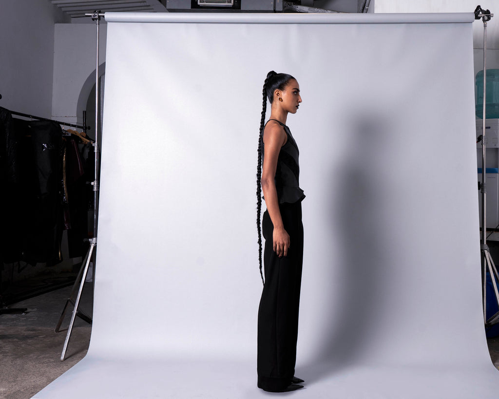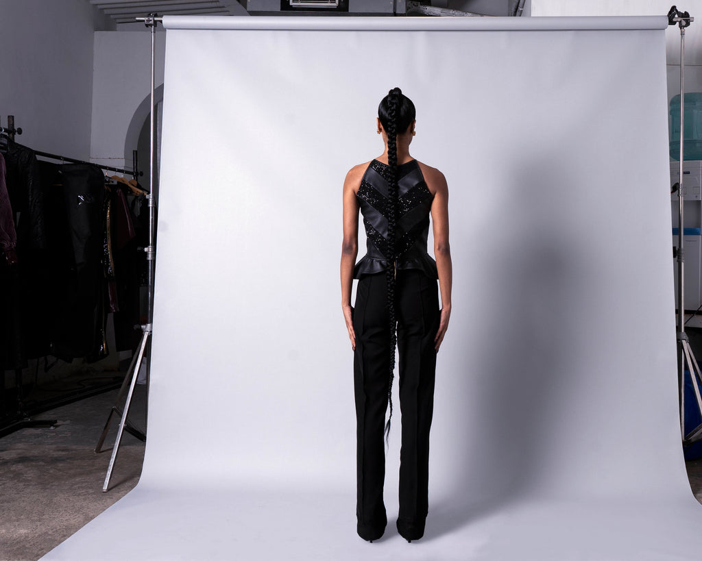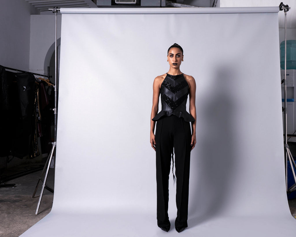 Featuring a classic black jumpsuit, with leather and sequins panels extending into a leather peplum with a halter neckline.