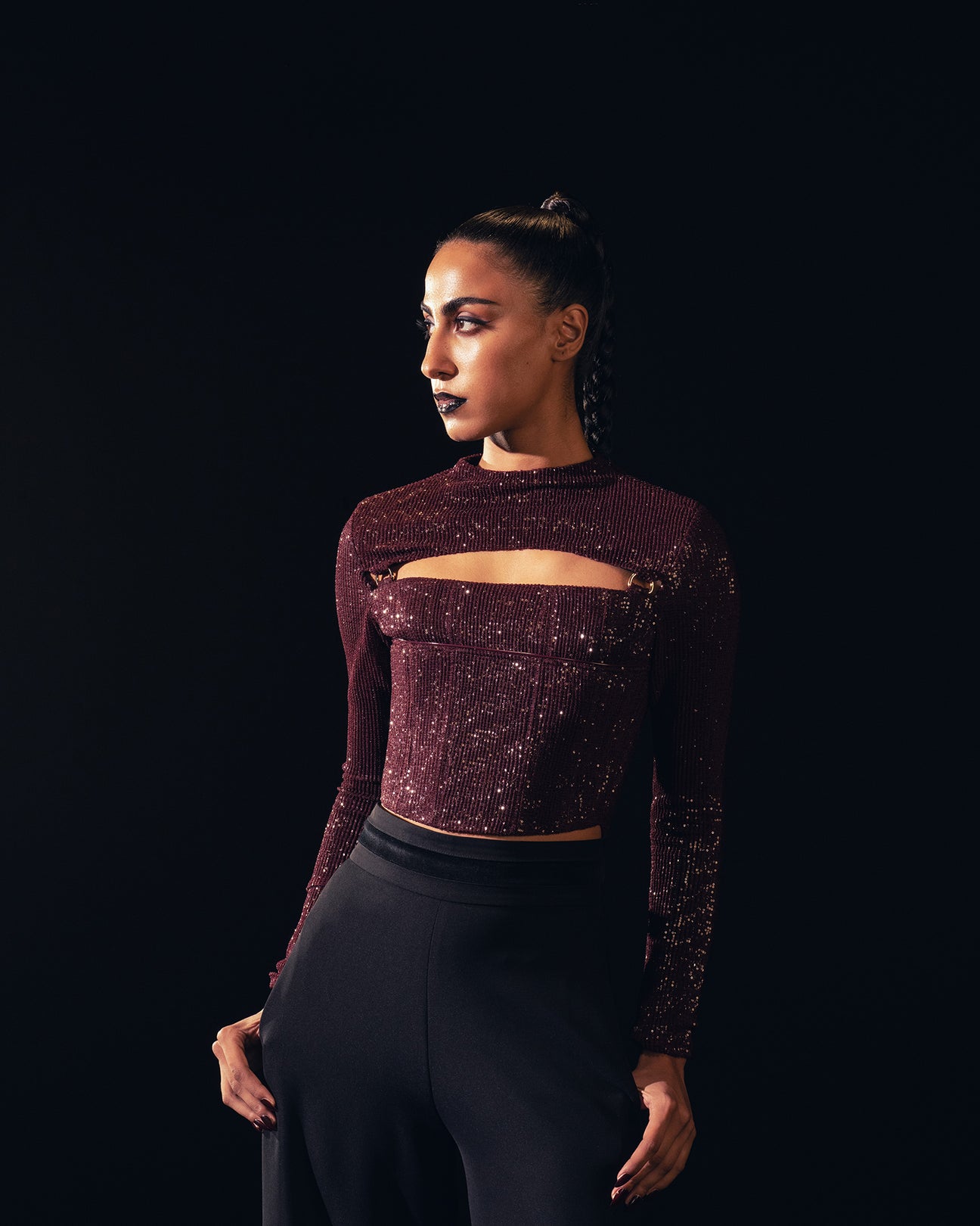 Featuring a corset top constructed with sequins fabric, with a front yoke cut-out and metallic loop details on the edge.