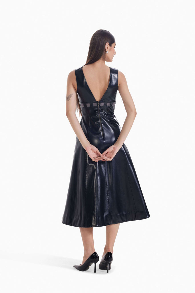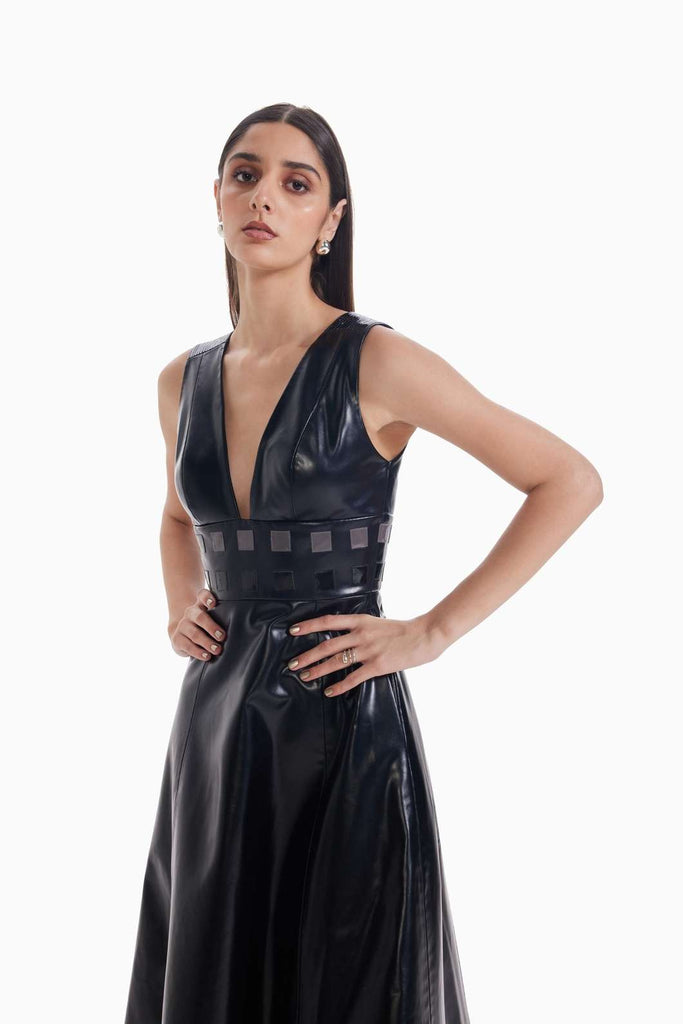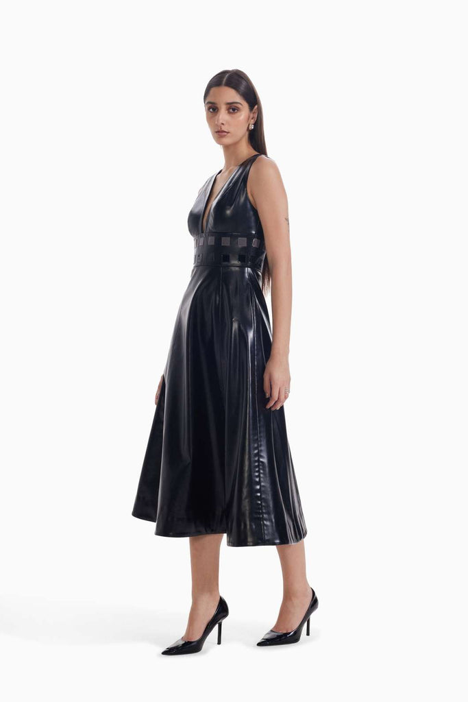 “Blackout Mood: Soft leather. Sharp impact.”, a high-shine stunner A-line dress cut from luxury soft leather, designed to sculpt and command. The deep V-back, cinched waist, and square applique accents bring bold geometry to a fluid silhouette. Perfect for a sultry dinner date or a high-fashion rooftop soirée, this dress is made for moments that demand presence.