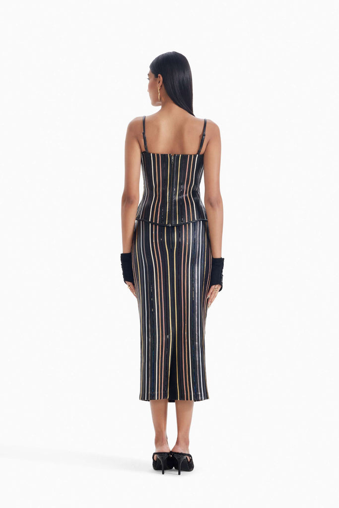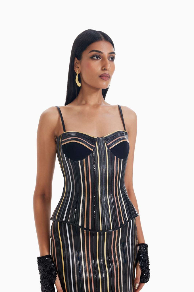 A structured corset with defined cups and thin straps, sculpted to snatch and shimmer. Vertical stripes in black, gold, and pink add a Y2K-meets-runway vibe. The peplum flare cinches the waist while sequins catch every spotlight. Perfect for rooftop parties, fashion week after-hours, or glam dinners. Style it solo or as a set—this top is a statement on its own.