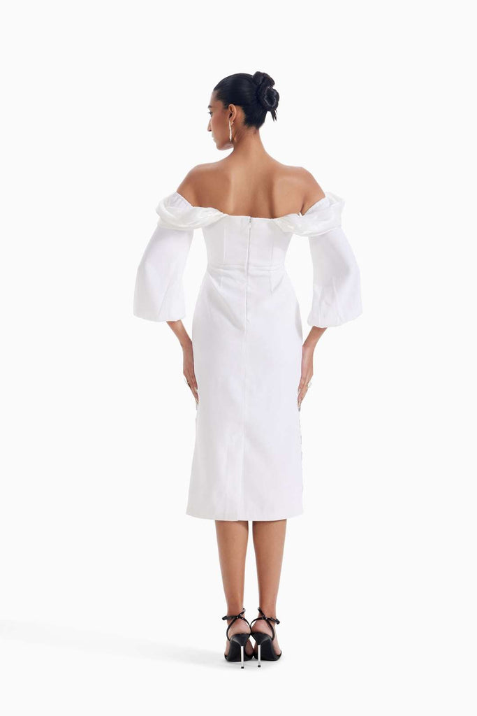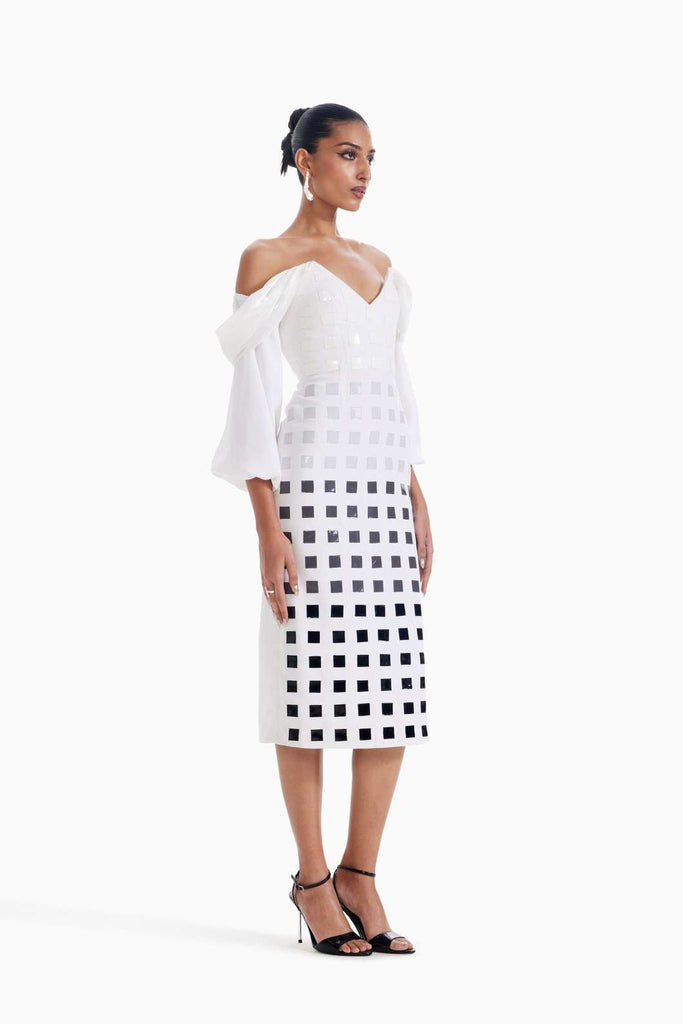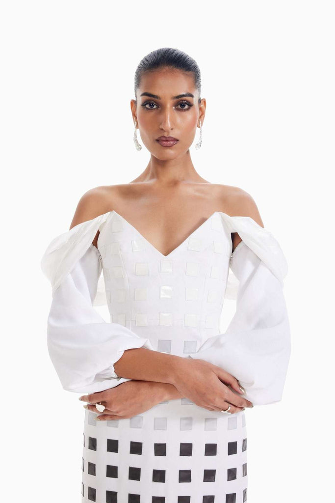 “Fictional Feelings: Draped in duality.” An off-shoulder fantasy sculpted in reflective white and black appliqués—stitched like secrets across silk. Voluminous sleeves bring the drama, while the gradient grid fades from clarity to mystery. The fitted silhouette hugs like a memory, structured yet soft, modern yet mythic. Perfect for gallery openings, moonlit dinners, or moments that feel half-real. The kind of piece that turns emotion into architecture.