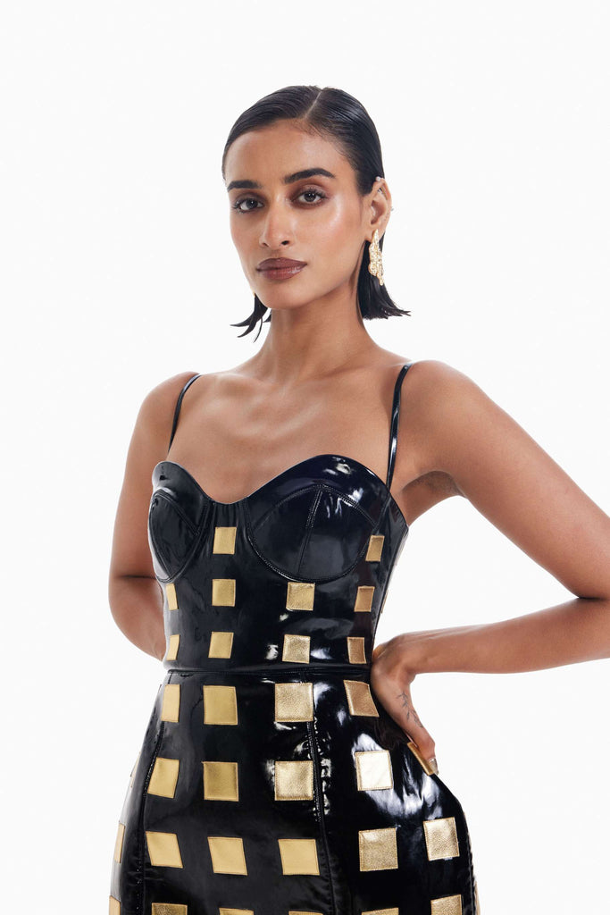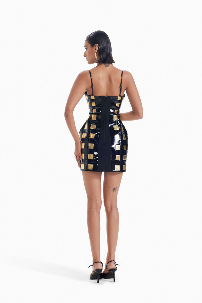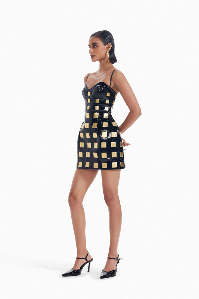 “Main Character Cut: Lights, curves, action.” Introducing a high-impact silhouette design sculpted from glossy leather and punctuated with gold metallic leather appliqués, its grid-like texture catches the light like camera flashes on a red carpet. The corseted plunging neckline and the dome structured skirt fit evoke cinematic drama, while the mini length keeps it unapologetically refined. Whether you're headed to a rooftop party or a fashion-forward premiere, this dress delivers main character energy with every step.