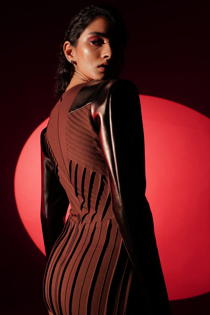 Featuring an Ophelia bodycon with spacetucks and faux leather seamwork detail on the sleeves.