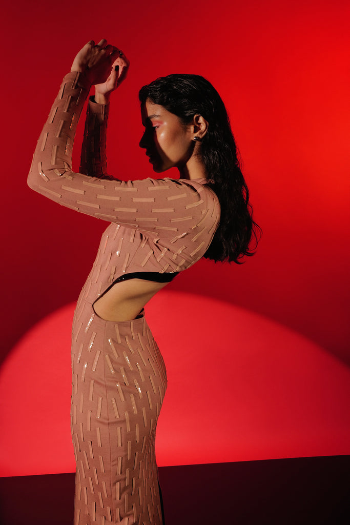 Featuring a Frida full length bodycon with faux patent leather applique and cut-out detail in the back.