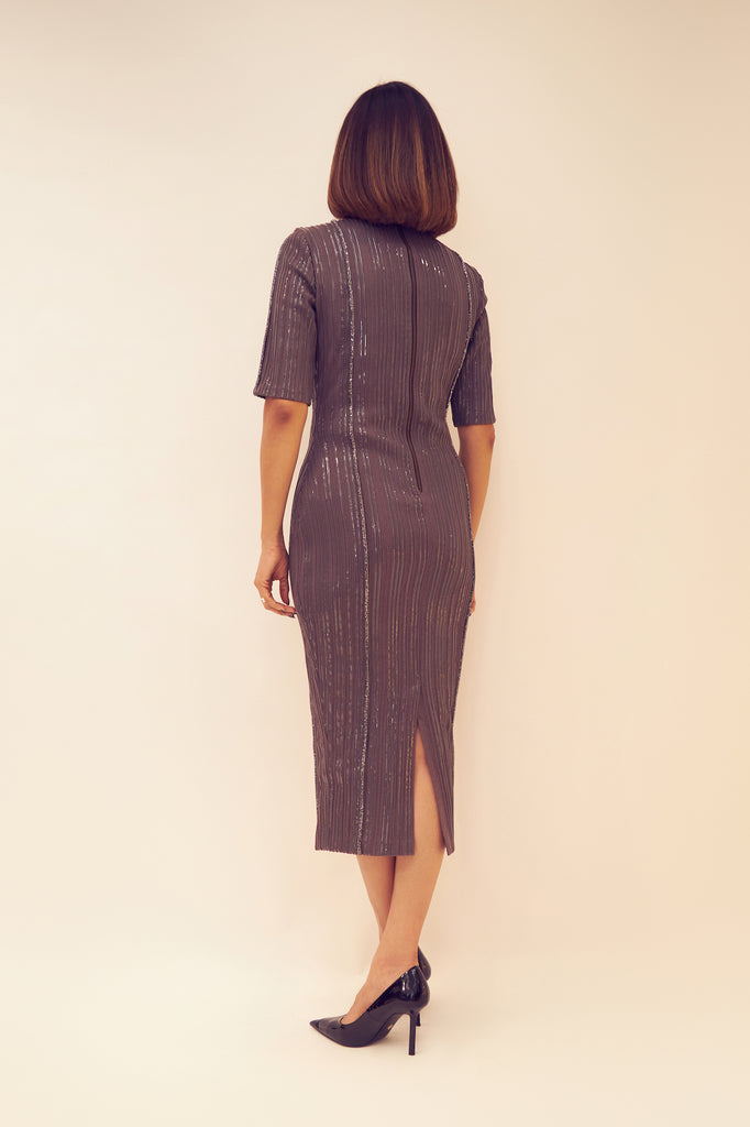 Featuring a bodycon heavily textured with pintucks, faux leather lines and embellished glitter cords with a slight high neck to provide that chic winter look!