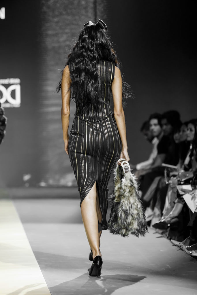 Introducing La Regina, a masterpiece of modern elegance and timeless sophistication. This sleek bodycon dress is adorned with meticulously crafted parallel pintucks and striking strips of glossy faux leather in warm, opulent tones of bronze and gold. From the high neckline to the full-length hem, each detail is designed to sculpt and enhance your silhouette, creating a mesmerizing effect. The harmonious blend of textures and rich colors adds a meticulous edge, making this dress an effortless choice for evening wear. Perfect for any occasion where you want to command attention, La Regina ensures all eyes will be on you, celebrating your regal allure and impeccable style.