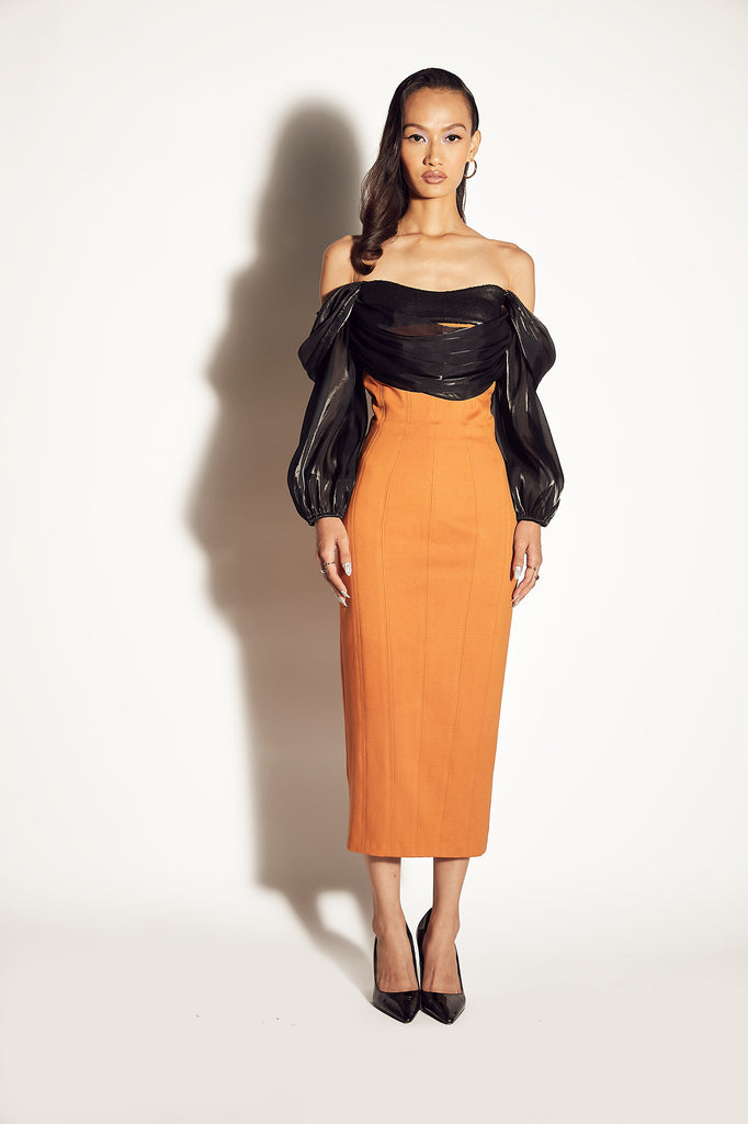 Featuring a stella bodycon with dense sequins bustier and luxury organza drape puff sleeves with jersey fitted skirt.