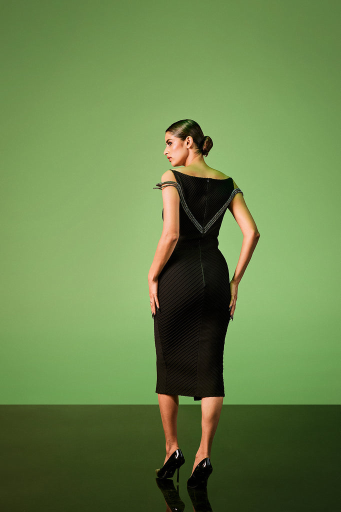Featuring a classic black textured bodycon with a bit of glitter wrapped up your sleeves! Dress it up or down as you please; it will always remain the timeless black dress in the closet.