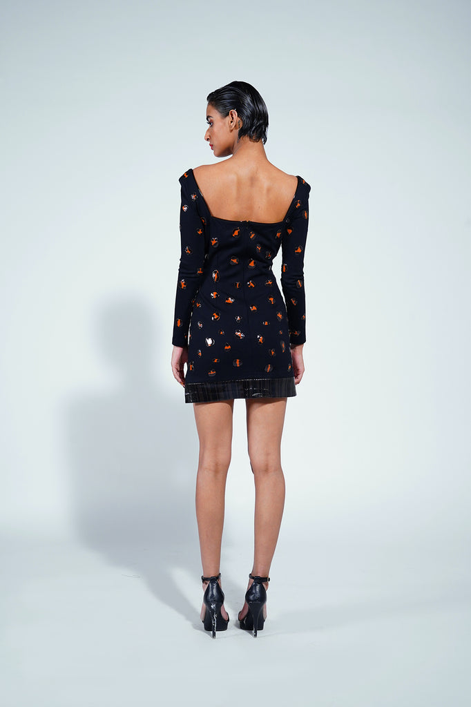 Featuring a mini bodycon with a square neckline and faux leather leopard appliqué pattern with subtle piping details, making it a dress that transcends day to night.