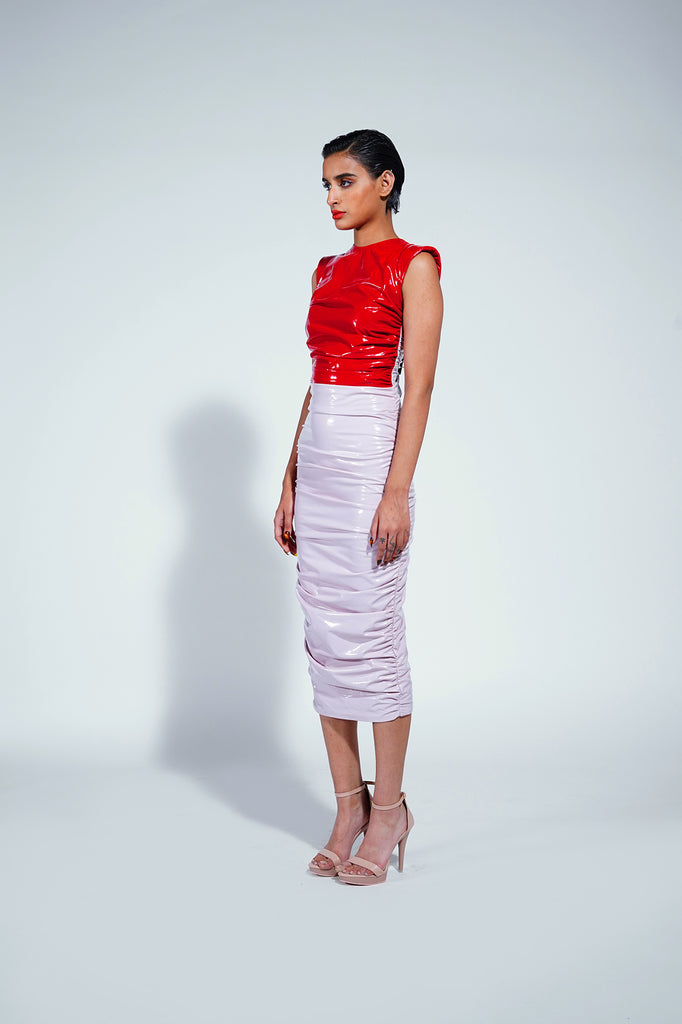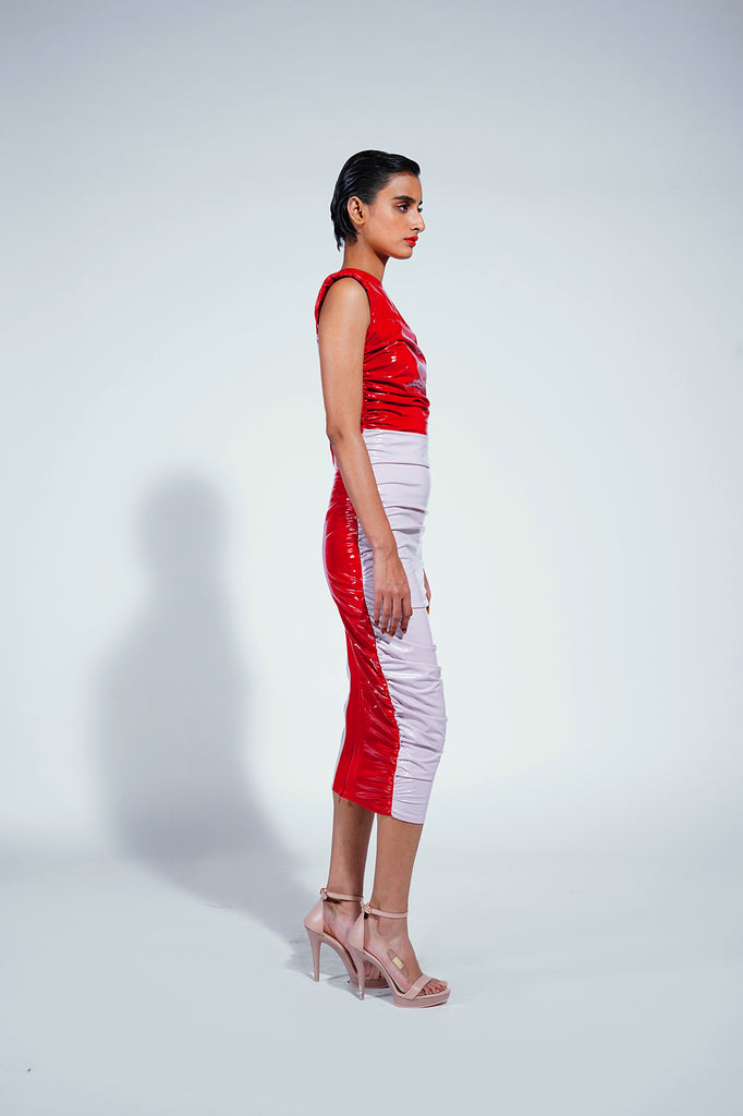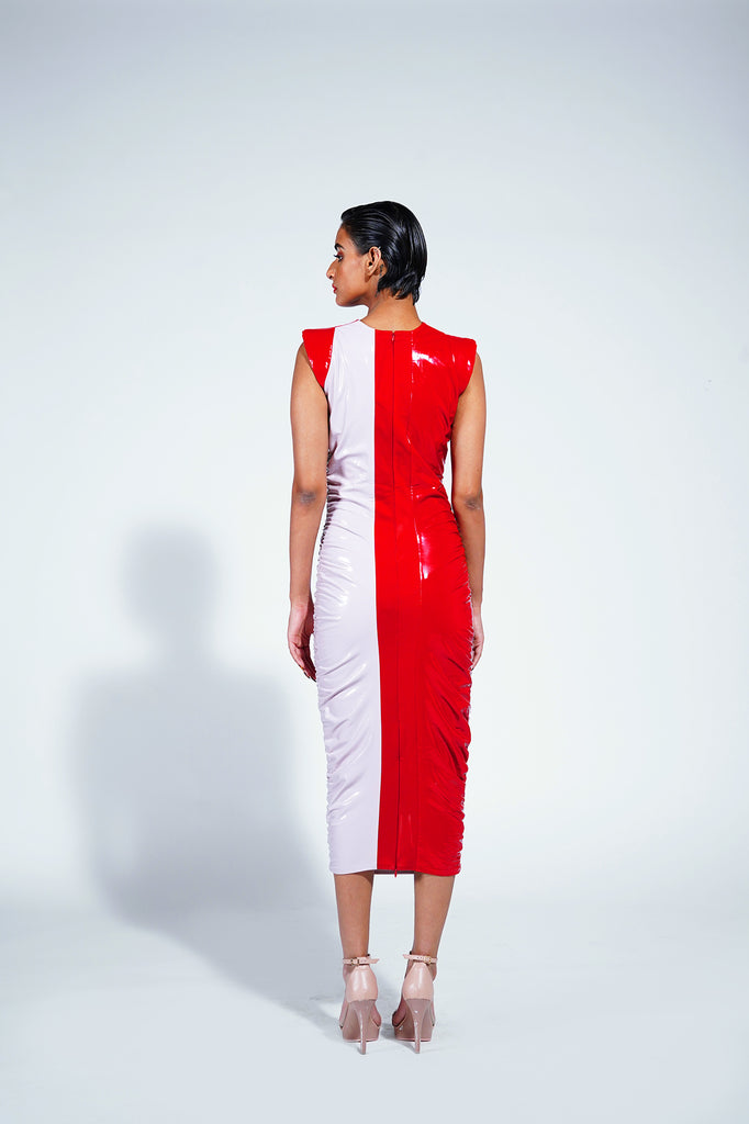 Featuring a colour block latex bodycon with ruching details on the front and back panels and shoulder pad construction with jersey panel on the sides of the zip for a comfort fit.