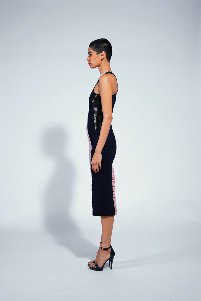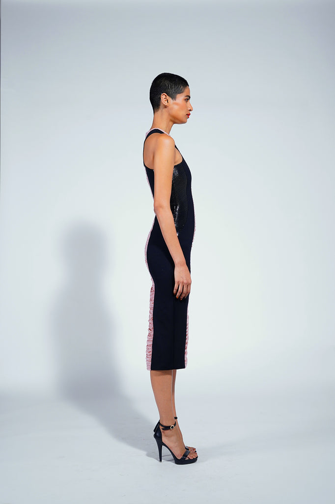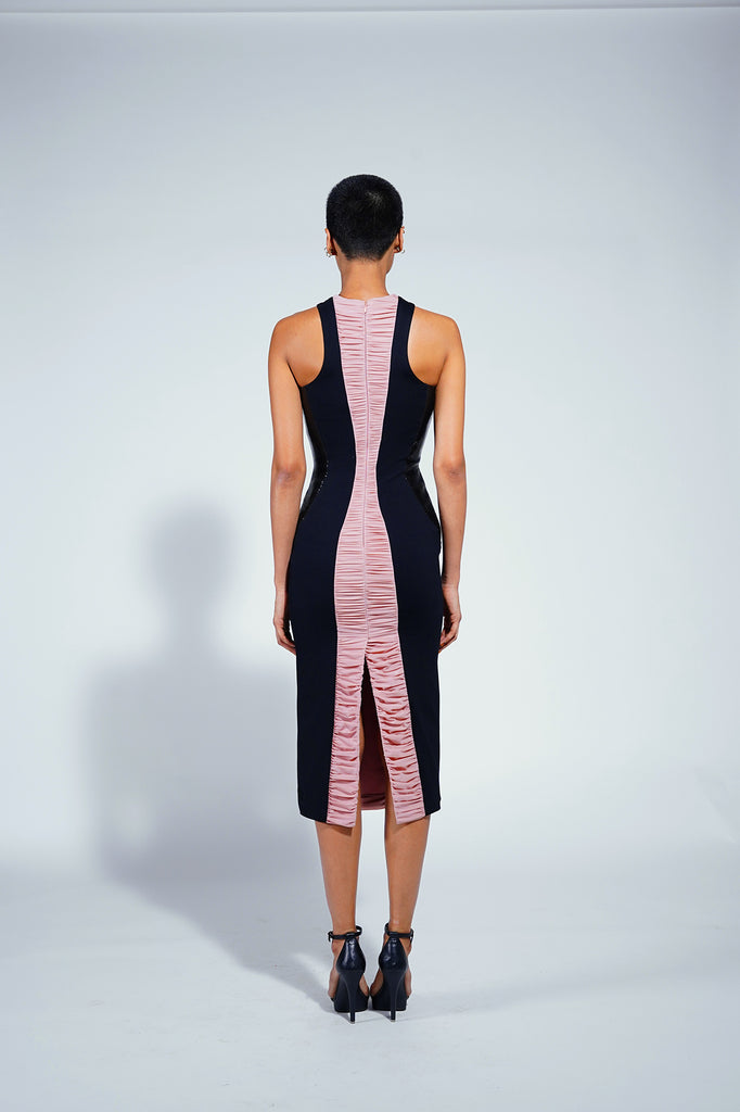 Featuring a racer cut colour block sleeveless bodycon with ruching at the centre and faux leather line detailed panel at the sides.