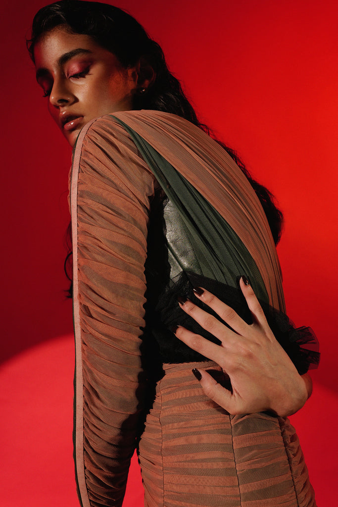 Featuring a fully net ruched bodycon with net peplum detail on the waistband and faux leather detail on the sleeves.