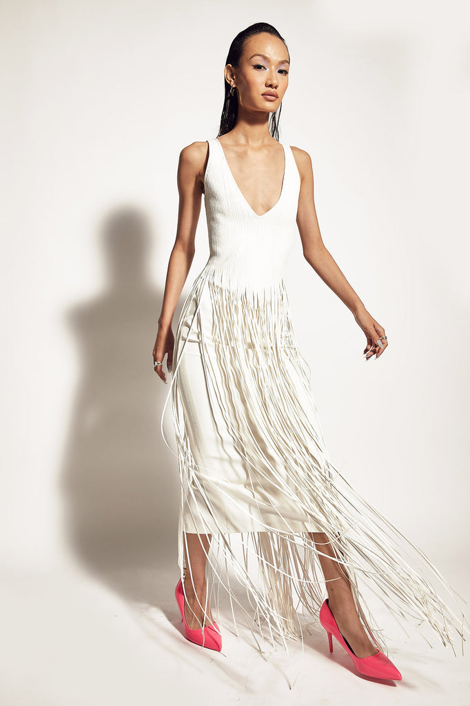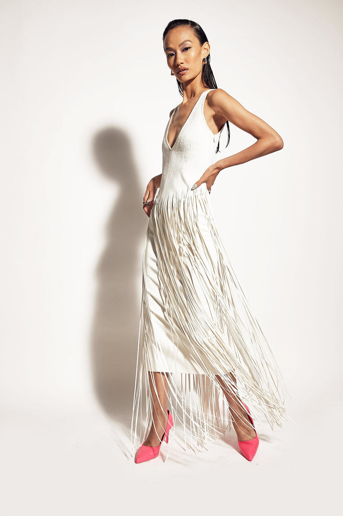 Featuring an olea bodycon with faux leather line stitched bodice and floor length fringe bottom.