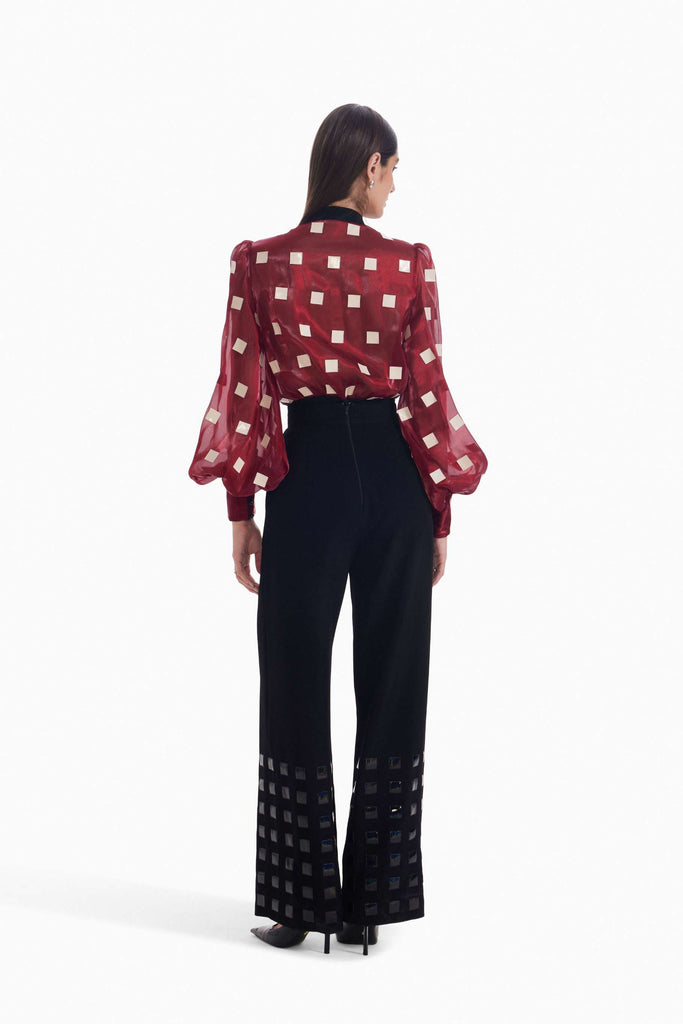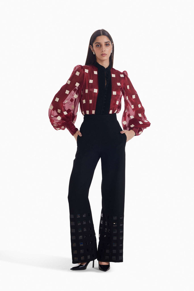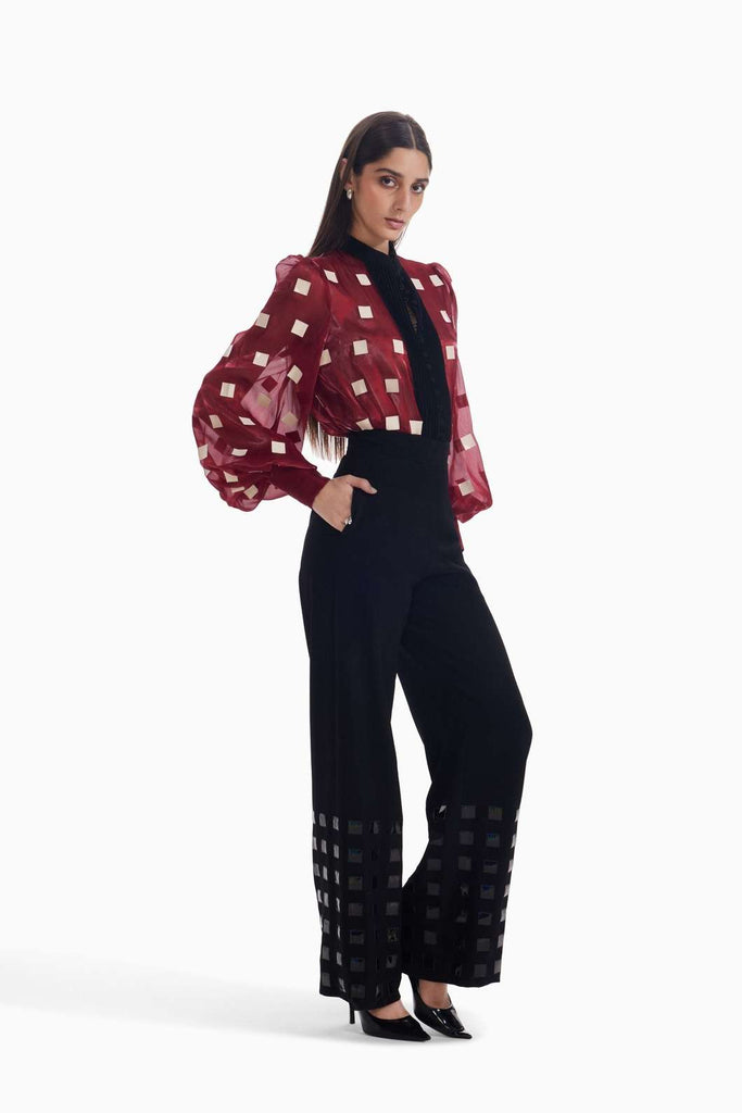 A sheer maroon statement layered with glossy almond square appliqués—built to command attention in every frame. Voluminous sleeves add cinematic flair, while the pleated black panel anchors the silhouette with structure. It doesn’t blend in—it broadcasts. Perfect for gallery nights, fashion week lounges, or power dinners that need a little static. The kind of piece that turns silence into spectacle.