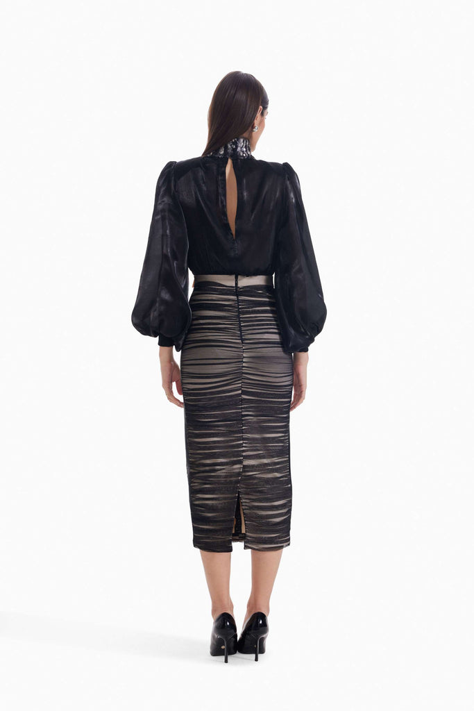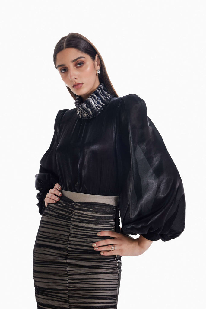 a high-impact silhouette sculpted in glossy black sheer organza with voluminous puff sleeves and a textured monochrome fur collar that frames the neckline like smoke curling around fire. The texture detailing on the fur adds architectural rhythm, while the fitted base keeps it sleek and commanding. Perfect for fashion week panels, power dinners, or any moment that calls for bold elegance.