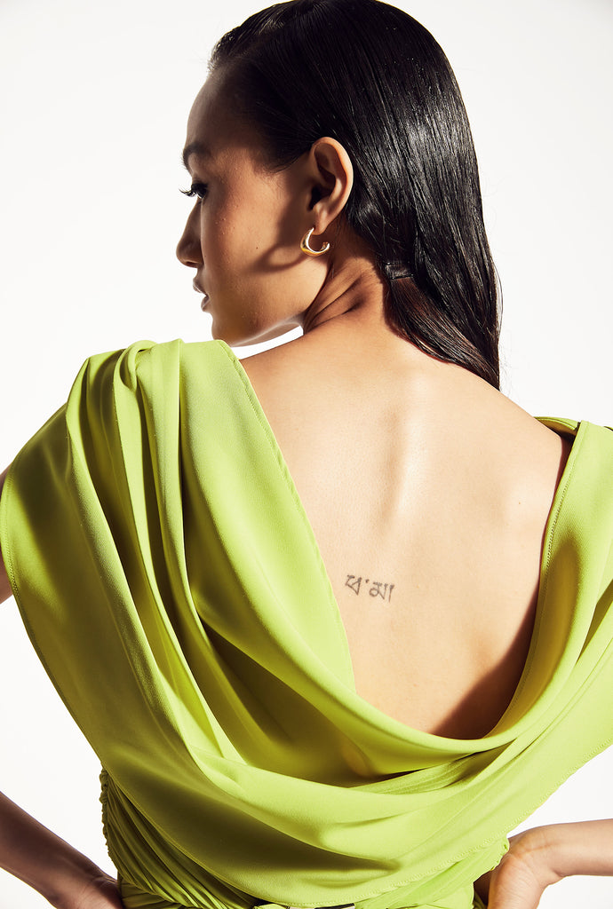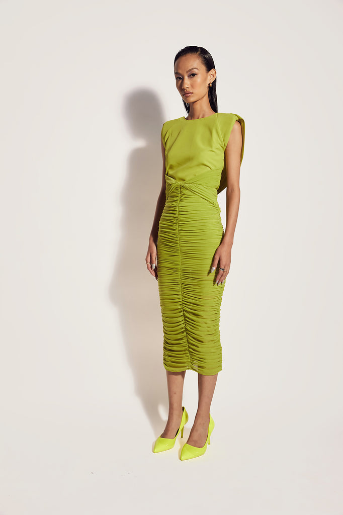 Featuring a layla ruching bodycon with t-shirt style bodice and cowl drape at the back