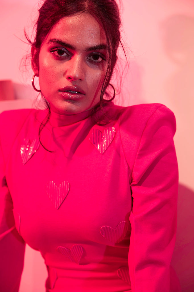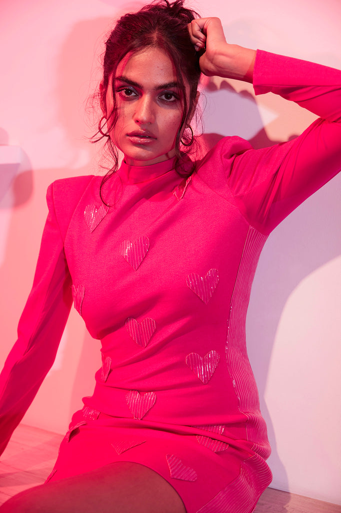 The signature silhouette of Sameer Madan’s bodycons. Power shouders with ful fitted sleeves, and when I say power shoulders, I mean POWER! Also look at the hearts applique carefully, each and every heart is made of leather-line work and the sides of the dress is also leather-lined! I would wanna say hot damn and hot pink.