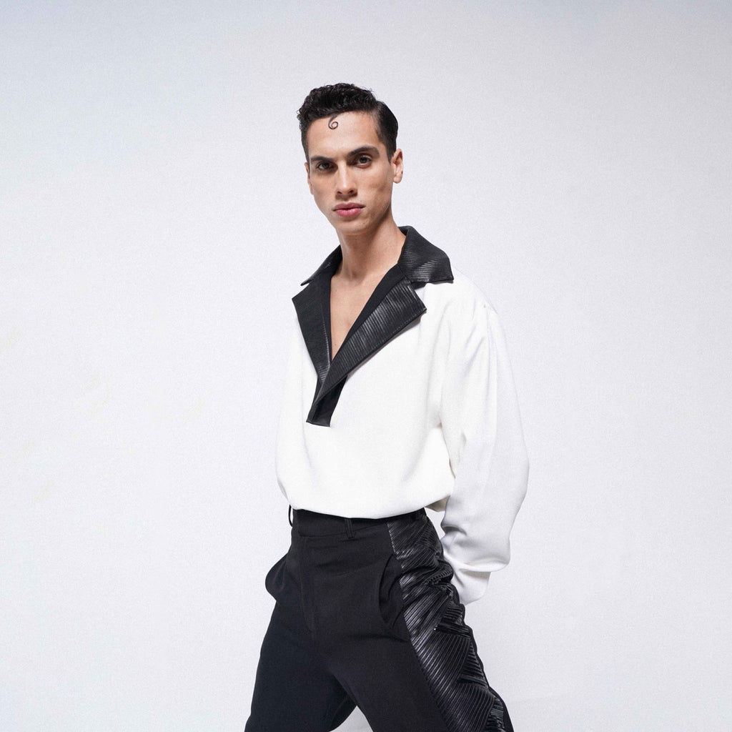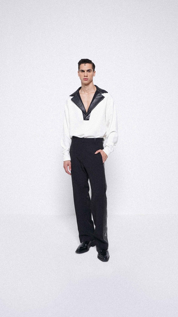 Introducing the Rum Runner T-shirt, a stylish white banana crepe full-sleeve design. This shirt features a striking lapel collar that is richly textured with black matte leather lines for a bold, eye-catching look. Additionally, the cuffs are detailed with zippers, adding an extra touch of rocker touch to the overall design.