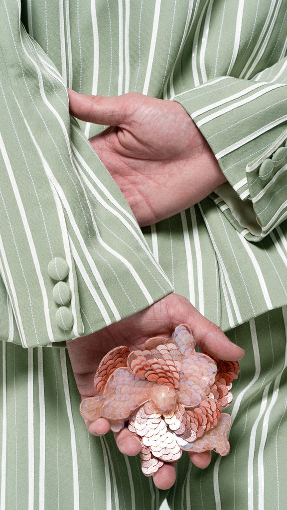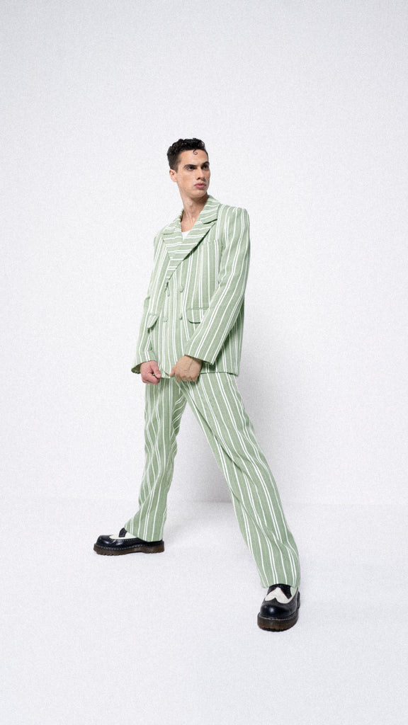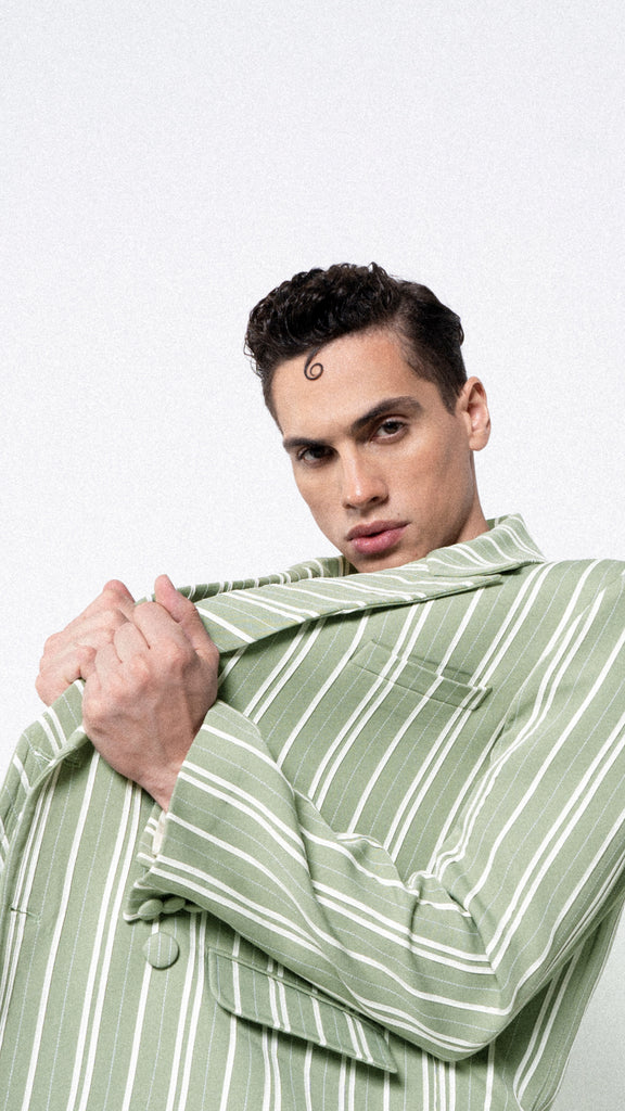 Featuring the sophisticated Shiso Mojito blazer in a calming sage color. This double-breasted blazer features heavily textured pinstripes crafted from glossy white faux leather lines, adorned with delicate white stitches between them. The intricate design and elegant color make it a perfect choice for a stylish brunch ensemble.