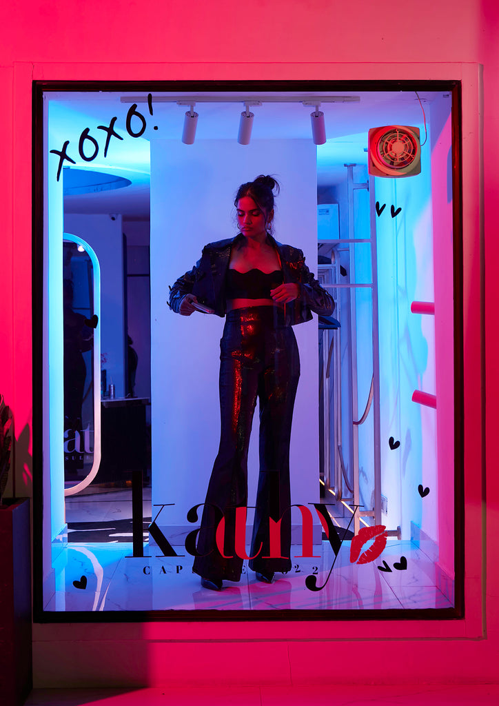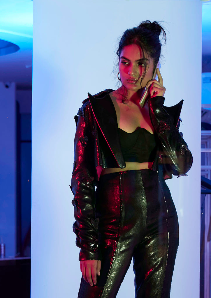 Cropped jacket with heart-tail collar and butterfly-hearts? Yes, a big yes! The contrasting threads on chosen hearts had me. It’s a bad girl jacket man, you gotta have it. Hell, I gotta have it! Oh almost forgot, the metallic sequins, it’s a party girl jacket!