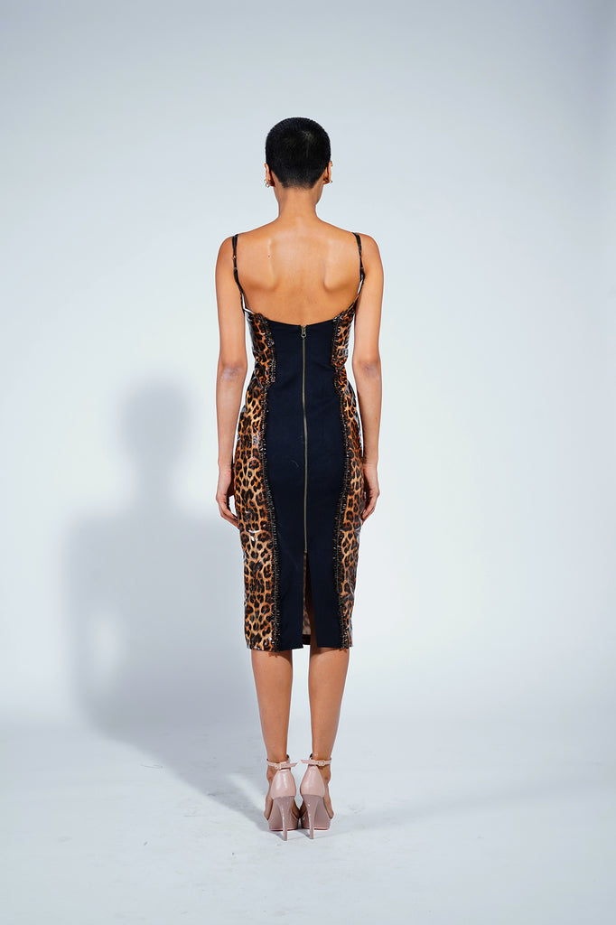 Featuring a lepard PVC bodycon with seamwork adding shape to the outfit with little ruffle details on the body and an elegant scoop back.