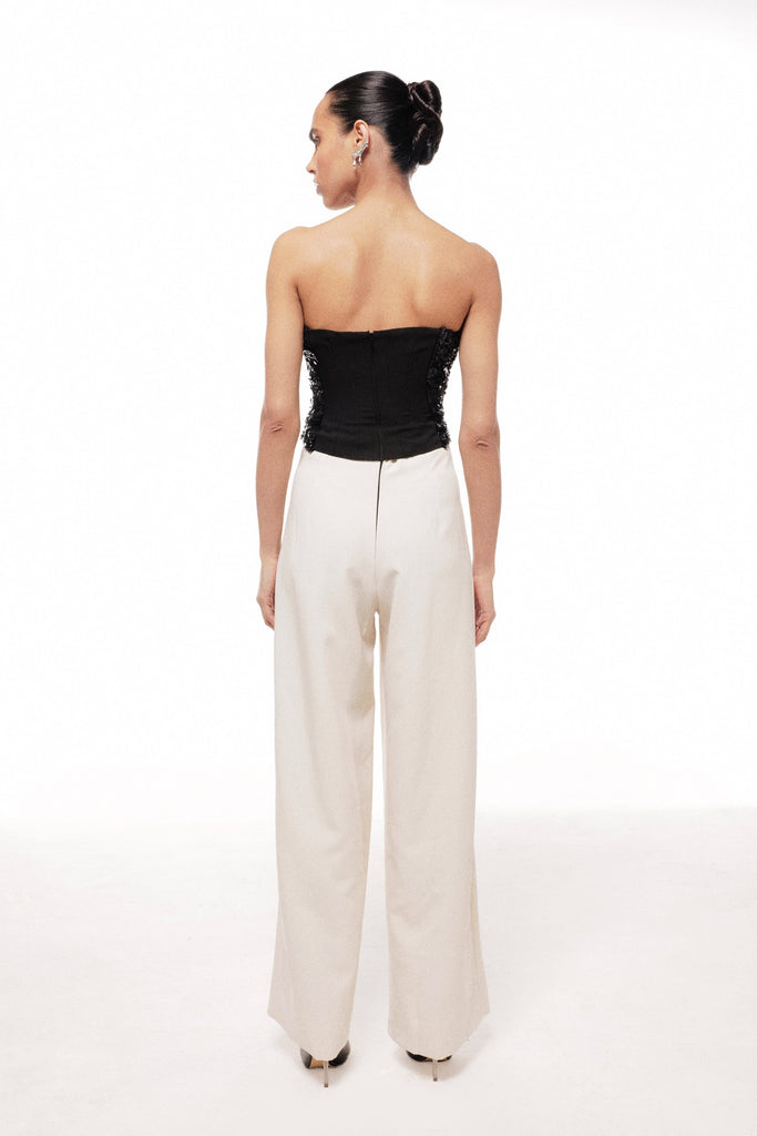 | Featuring, a tube jumpsuit having a bodice heavily textured with hand embroidered crisp combination of sage and blue sequin applique panels and a center panel of black matte leather lines in contrast with soft beige colored full-length wide-leg trousers. |