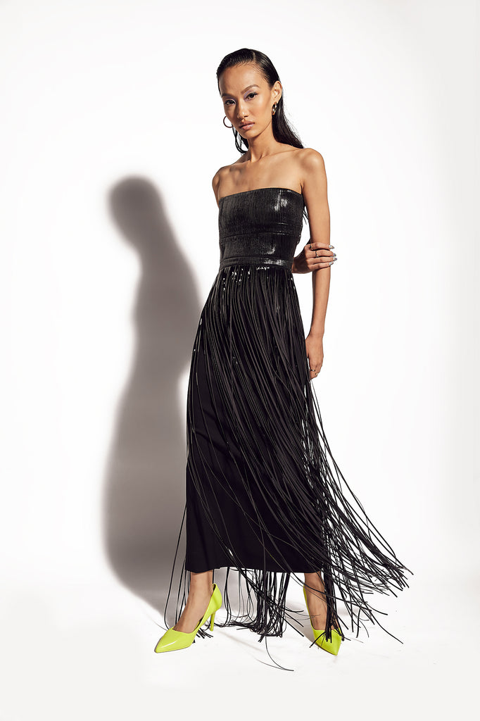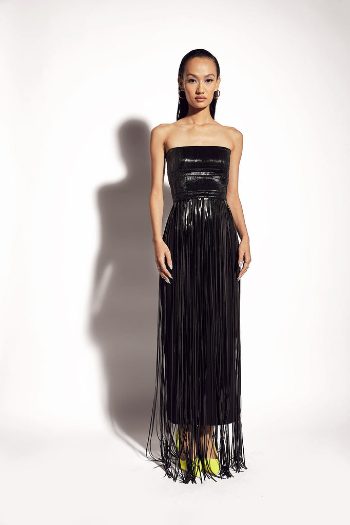 Featuring a Black Mystic tube dress with faux patent leather lines stitched on the bodice and floor length uniform fringes attached at the waist.