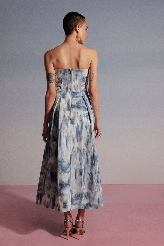 Featuring a tube A-line midi dress adorned with white faux leather line glitch effect applique on both sides of the bodice attached to an airy pleated skirt to make you feel all fresh in style & breezy this summer.HIGHLIGHTS