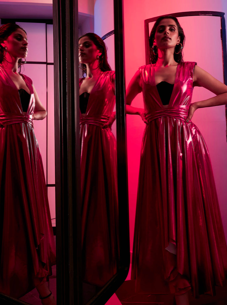 This dress is a vibe. vibe I tell you, VIBE! Power-shoulders with insertion of metallic sequins and a self-fabric belt attached in A-Line silhouette. Did I tell you there’s an under-skirt attached to it for more flow? It’s THE METALLIC DRESS you gotta have!
