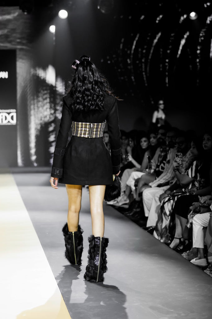 Introducing the Silvana Nero Dress, a captivating mini dress that effortlessly blends elegance with modern allure. Crafted from sumptuous felt, this full-sleeve marvel features glossy faux leather line appliqué details near the cuffs, adding a touch of luxurious refinement. The padded shoulders transition seamlessly into a structured bodice and corseted waist, accentuating the wearer's hourglass figure. The pièce de résistance is the beautifully dome-like structured skirt, which adds a dramatic flair, making this dress the perfect choice for a romantic and luxurious dinner and dance night. This stunning piece ensures all eyes are on you, leaving your partner and onlookers in awe of your impeccable style.
