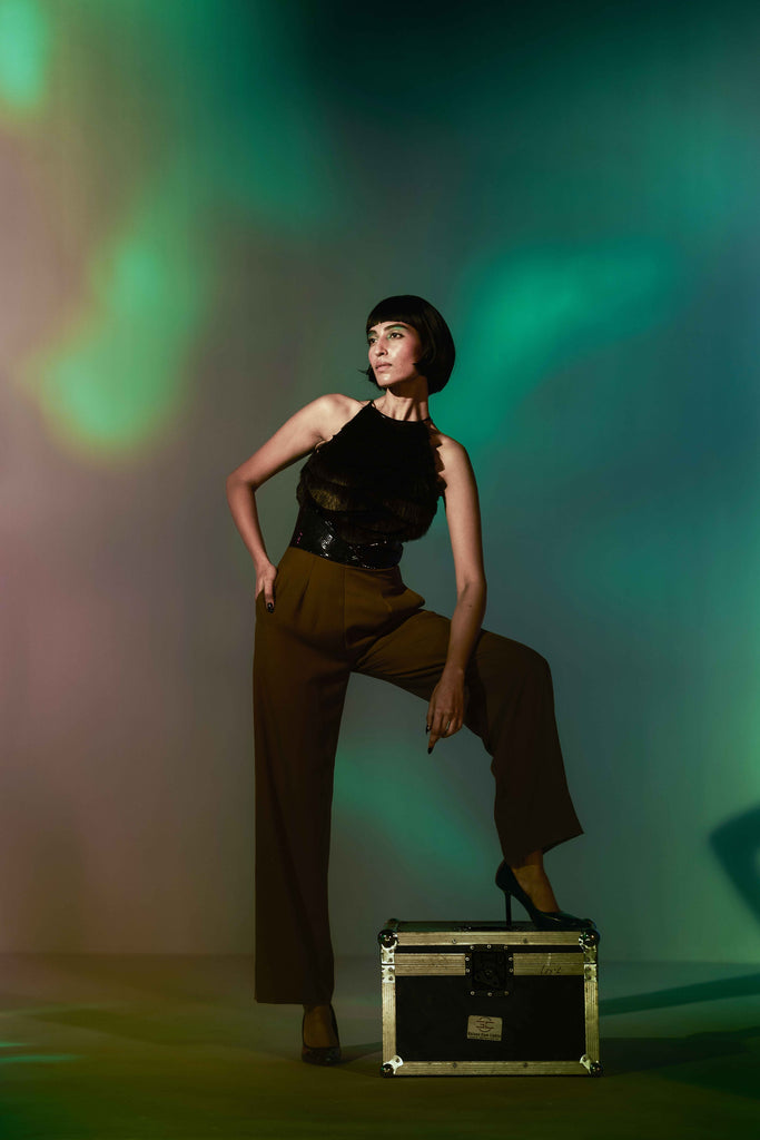 Presenting the 'Crescendo Jumpsuit,' an enchanting creation that blends sophistication with a touch of bold allure. This stunning jumpsuit features a halter neckline adorned with glossy faux leather appliques, meticulously arranged to evoke the grandeur of a regal chandelier. The design seamlessly transitions into sleek, straight-fit pants, while a subtly scooped neckline adds a hint of sensual charm. Perfect for a vibrant girls' night out or a chic after-work soirée, the 'Crescendo Jumpsuit' ensures you make a memorable entrance with its captivating elegance and contemporary flair. Embrace the night with confidence and style.