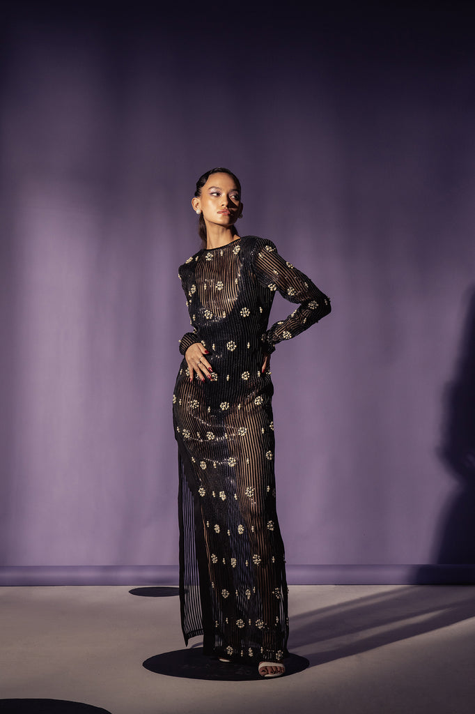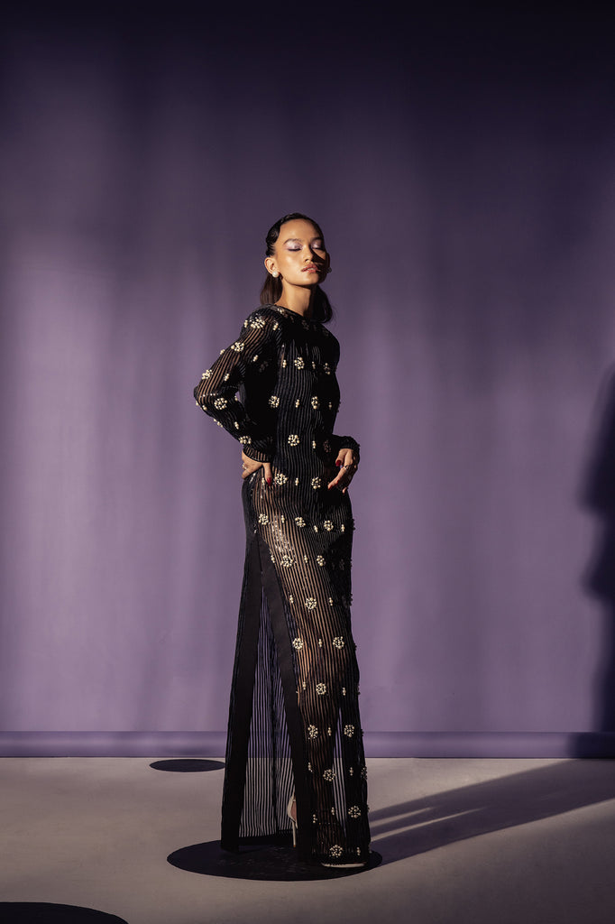 leather lines and pearl embroidery. A deep v-cut at the back and sultry slits on the sides, makes it