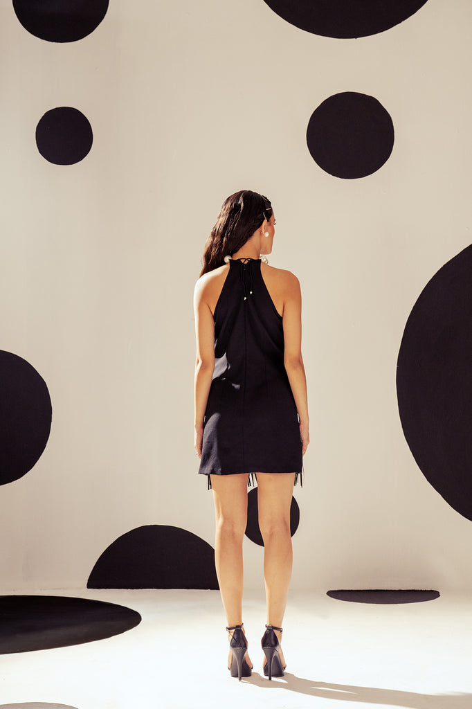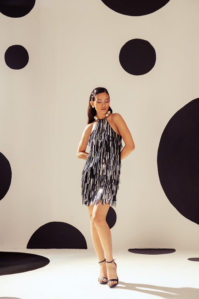 sequins in black, white and silver adorned with macro size pearl, the dress radiates shimmer at every angle, making it an iconic statement outfit for your wardrobe.