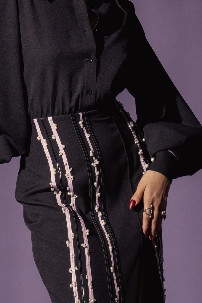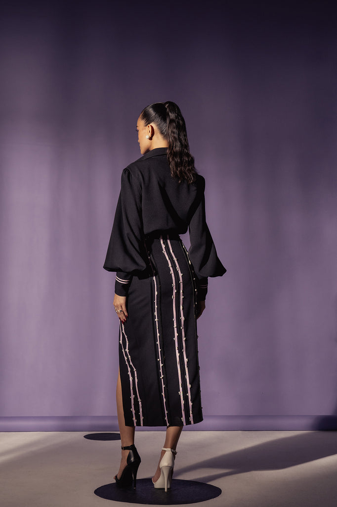 Featuring a button down shirt dress with bishop sleeves and long cuffs, and a pencil skirt bottom embellished with micro pearls and leather lines in pattern.
