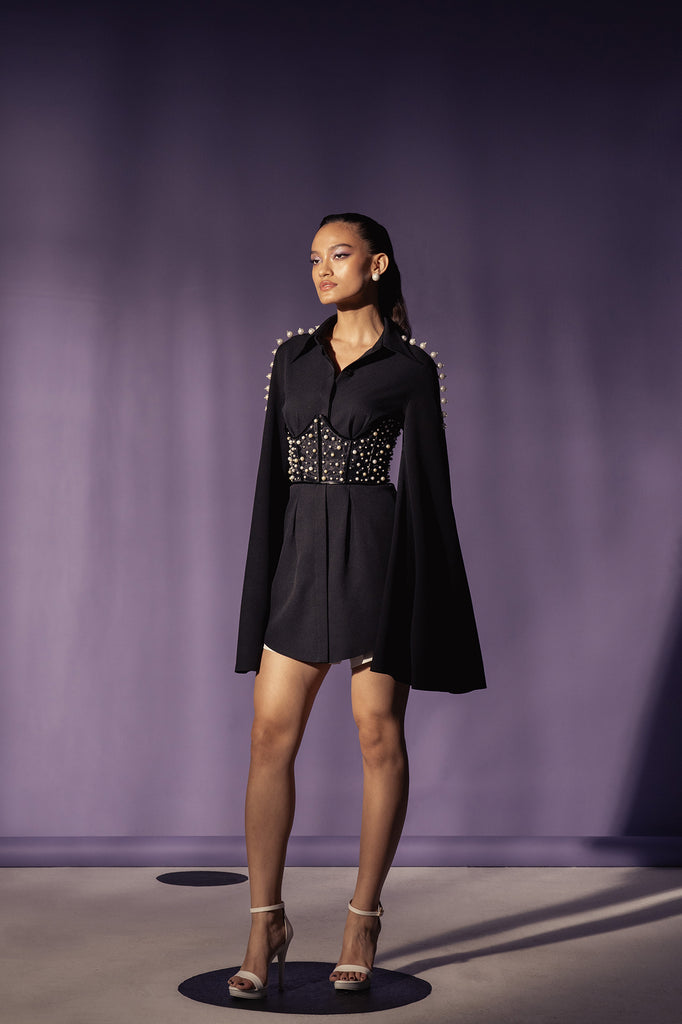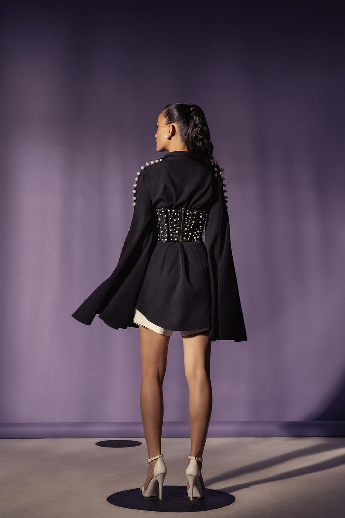 Featuring a shirt with inbuilt corset to cinch the waist and long slit sleeves embroidered with pearls on the edges.